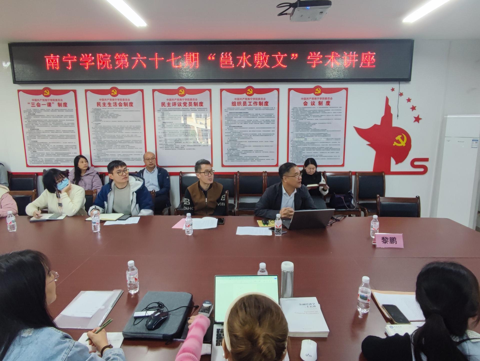 20231121日上午,为培养教师科研能力,提高国家社科项目申报质量,学校邀请广西大学黎鹏教授开展第67期邕水敷文学术讲座,讲座题为“国家社科基金年度项目申报选题指导报告”,讲座在行政楼425举行,讲座由数字经济学院管卫利院长主持,数字经济学院、商学院、艺术设计学院以及申报2024年国家级社科项目的教师参会。