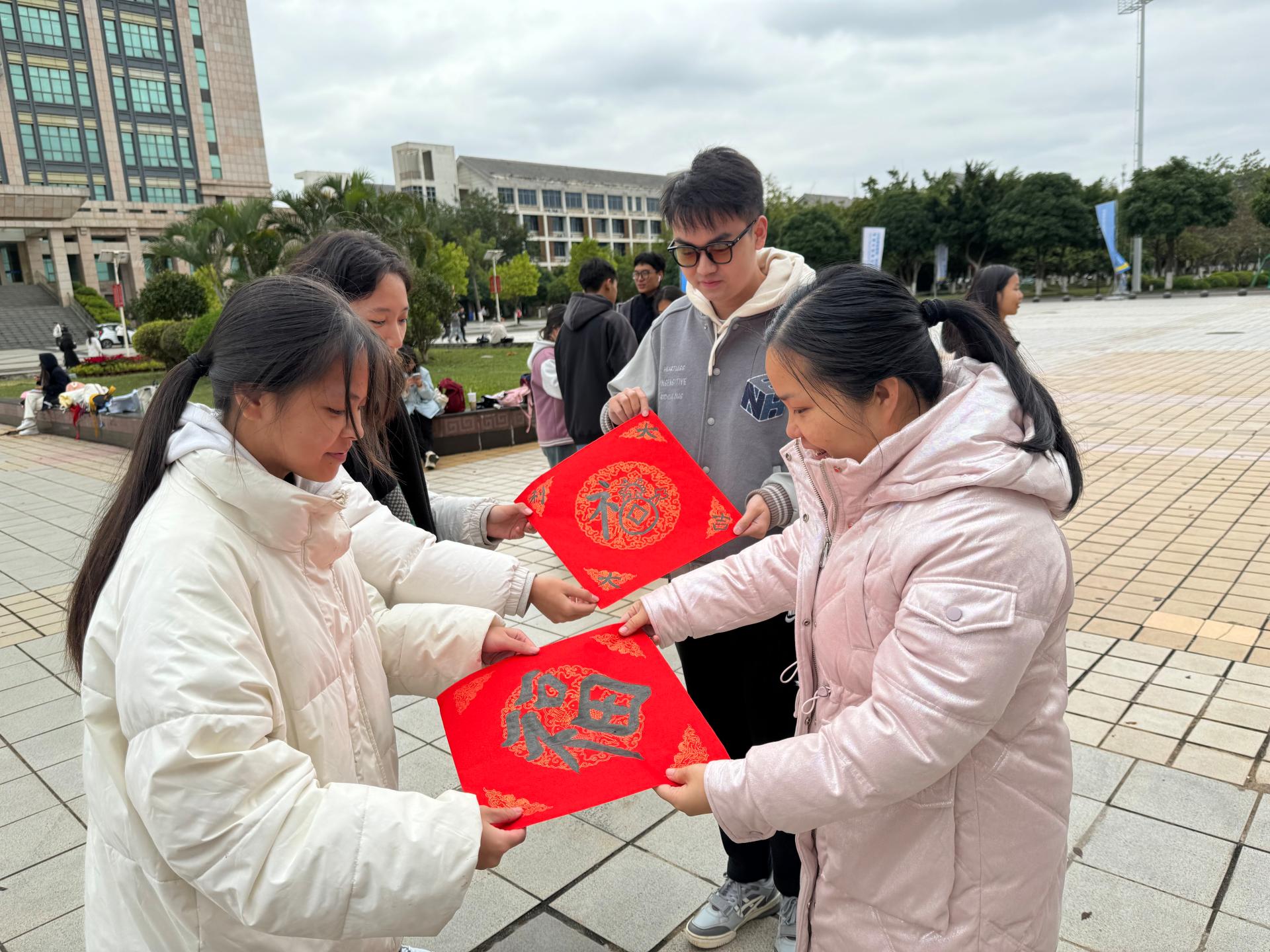 活动现场,笔墨纸砚被整齐地摆放在桌子上,同学们大胆挥毫,送福来此。将祝福融入一笔一画之中,将吉祥与福气融入每一个字中,书写着不同形态的“福”。福字在中华文化中意义非凡 ,每逢新年,人们都会贴“福”到各种地方,当然在这里我们不仅仅有“福”,还有“顺”“财”“万事如意”等蕴含着美好祝福的词句。这一副副写满新年祝福的春联和“福”字,写的是汉字,报的是节讯,暖的是人心。活动现场,红纸黑字间流淌着浓厚氛围,“书法家”们挥毫泼墨,将一幅幅精美的对联和福字赠送给现场师生。拿到对联和福字的师生,喜悦之情溢于言表,总计送出1300余件作品。