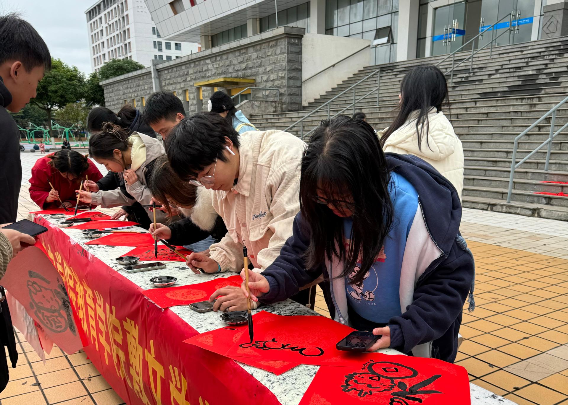 12月19日,教育学院在体育馆南面广场开展敷文学堂之“翰墨迎新·辰龙送福”书法实践活动,活动由书法课程教师盛子晏组织,教育学院首届学前教育专业全体学生、书法选修课学生和书法兴趣爱好者积极踊跃参加了本次活动,用手中的笔墨书写浓浓的年味。