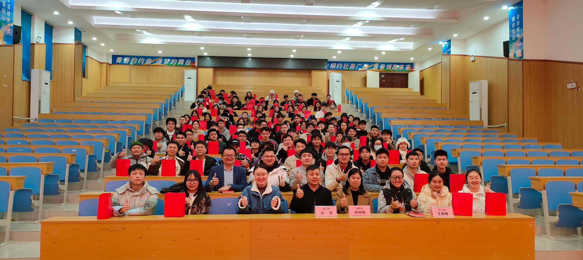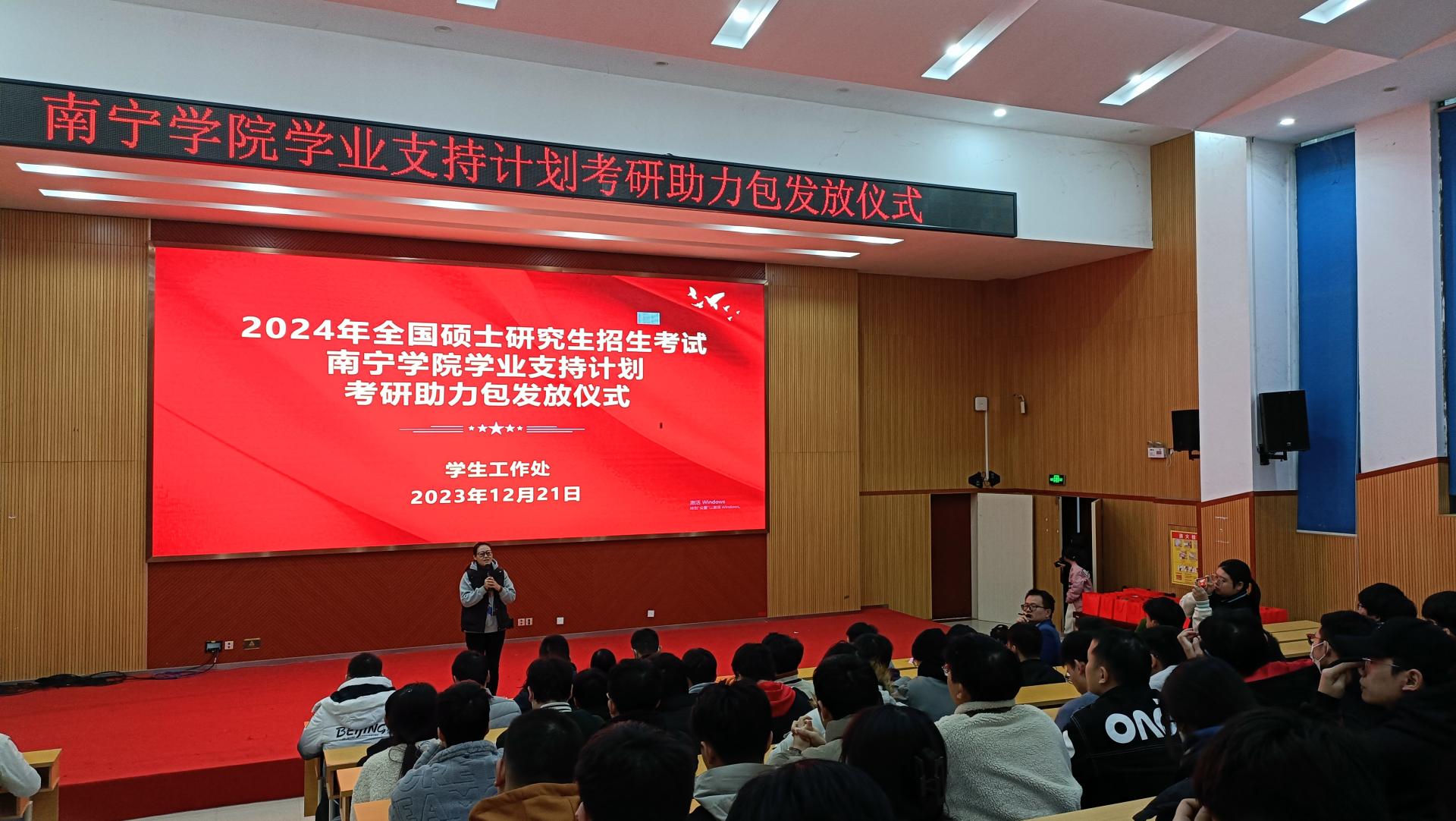 2024年全国硕士研究生招生考试即将“开战”,为确保考试顺利进行,全面助力学子考研,我校于12月21日下午在南宁学院学生活动中心103阶梯教室举办2024年全国硕士研究生招生考试南宁学院学业支持计划考研助力包发放仪式。南宁学院教务处胡晓敏处长、学生工作处王静静处长、田爽副处长和各二级学院学生科负责老师以及近200名备考考生参加助力包发放仪式。