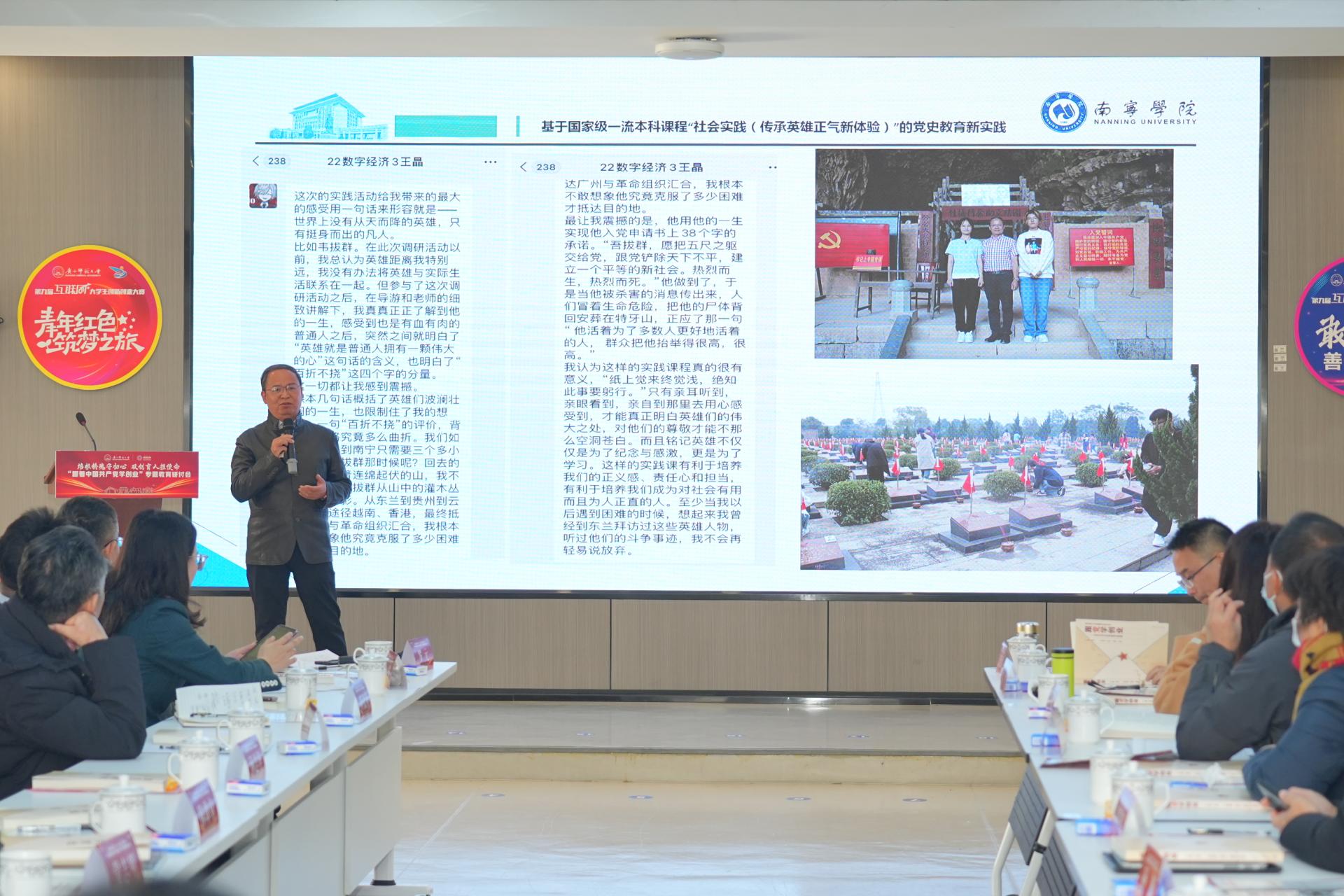 南宁学院是“‘跟党学创业’思创融合育人共同体”联合发起单位,在专题教育研讨会上,学校陈雄章教授作《创业艰难百战多--基于国家级一流本科课程“社会实践(传承英雄正气新体验)”的党史教育新实践》的主题分享。他着重介绍了所主持的国家级一流本科课程专创融合、思创融合的实践做法,课程从为学生精神铸魂、提升学生综合实践能力两大问题意识出发,紧紧围绕英雄精神传承主线,设计了四大专题讲座、四大主题实践活动和四条广西特色实践资源路线,突出课程内容、形式上的实践新体验,引领学生走进英雄、记录英雄、传播英雄、关爱英雄,助力学生筑牢民族精神之魂,让学生在广西区域的广阔课堂行中学,学中思,思中创,提升服务区域经济社会发展的意识与能力,开辟了中国共产党创新创业历史教育的新实践。
