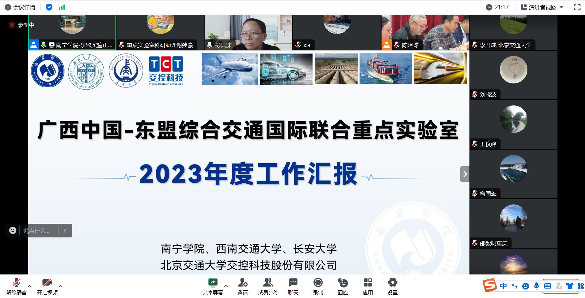 12月28日,广西中国-东盟综合交通国际联合重点实验室(以下简称“重点实验室”)在南宁学院南硅谷E201会议室召开第三次重点实验室学术委员会会议。此次会议采用线上线下相结合的方式进行,重点实验室理事长、南宁学院校长李栋学教授、重点实验室学术委员会主任彭其渊教授/博导、副主任雷翔/正高级规划师、王俊峰教授/博导和委员们、南宁学院相关部门、交通运输学院及重点实验室相关人员出席本次会议。会议由彭其渊教授主持。