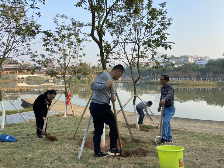 后勤保障与基建管理处的工作人员为同学们做了任务安排,告知本次的劳动内容是为黄花风铃树施肥,以保证来年风铃花的盛开,讲解了挖坑、施肥的注意事项,并做了现场示范。在活动现场,同学们分工明确,充满热情地投入到挖坑施肥工作中。经过一个半小时的劳动,完成了对不孤湖南岸共计120棵黄花风铃树的施肥,同学们不仅学会了绿化施肥的技巧,还体会到了劳动的辛苦和快乐。