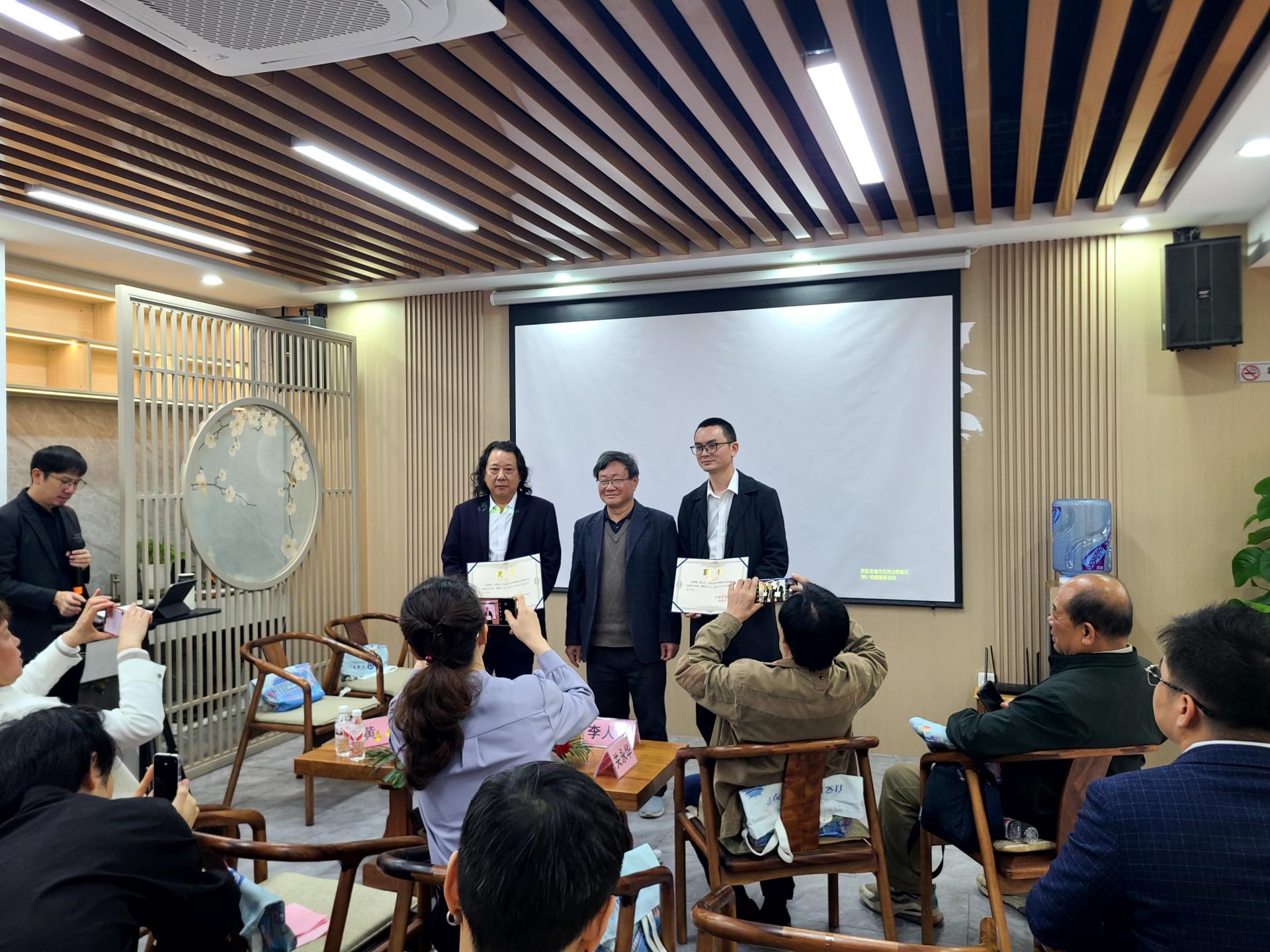 南宁学院副校长李陶深为钦州市工艺美术协会会长周三平、桂林市工艺美术协会会长付新阳颁发南宁学院陶瓷创意文化产业学院校外指导老师聘书