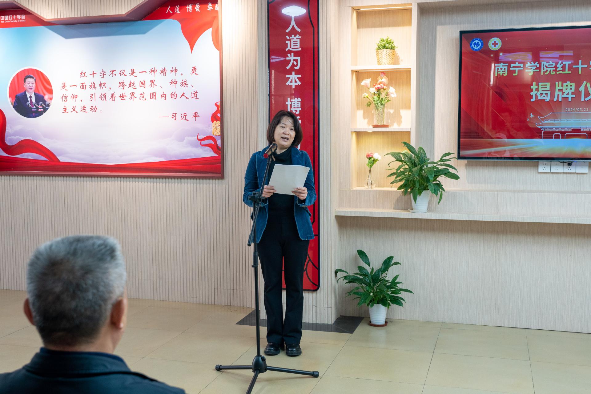 仪式上,南宁市红十字会党组书记黄海燕致词,黄海燕书记提出,2021年11月,在南宁市红十字会的指导和南宁学院的支持下,成立了南宁学院红十字会,之后在校内开展了应急救护培训、无偿献血和捐献造血干细胞等一系列富有成效的活动,受到师生们的欢迎。希望通过这个文化长廊,把学校精神文明创建、德育工作、素质教育、生命教育等与红十字文化宣传有机结合,为广大师生打造一个集“红十字文化宣传、应急救护知识普及和休闲阅读体验”为一体的开放式公共学习空间。