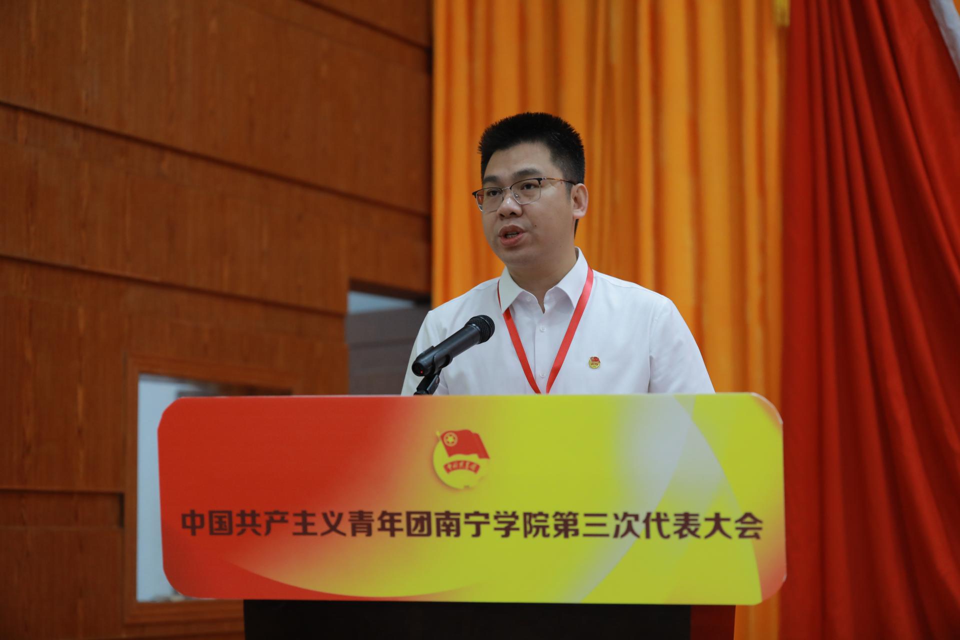 李志同志代表共青团南宁学院第二届委员会向大会作题为《高举旗帜跟党走踔厉奋发勇担当为建设全国一流的应用技术大学贡献青春力量》的工作报告。报告系统回顾了学校第二次团代会以来学校团委在青年思想引领、基层组织建设、服务学生成长、提升大局贡献度等各项工作中取得的成绩,全面总结了共青团南宁学院第二次代表大会以来我校共青团工作的经验。报告阐述了新时代学校共青团面临的新机遇、新挑战和肩负的新使命,明确了未来五年学校共青团的主要目标任务。