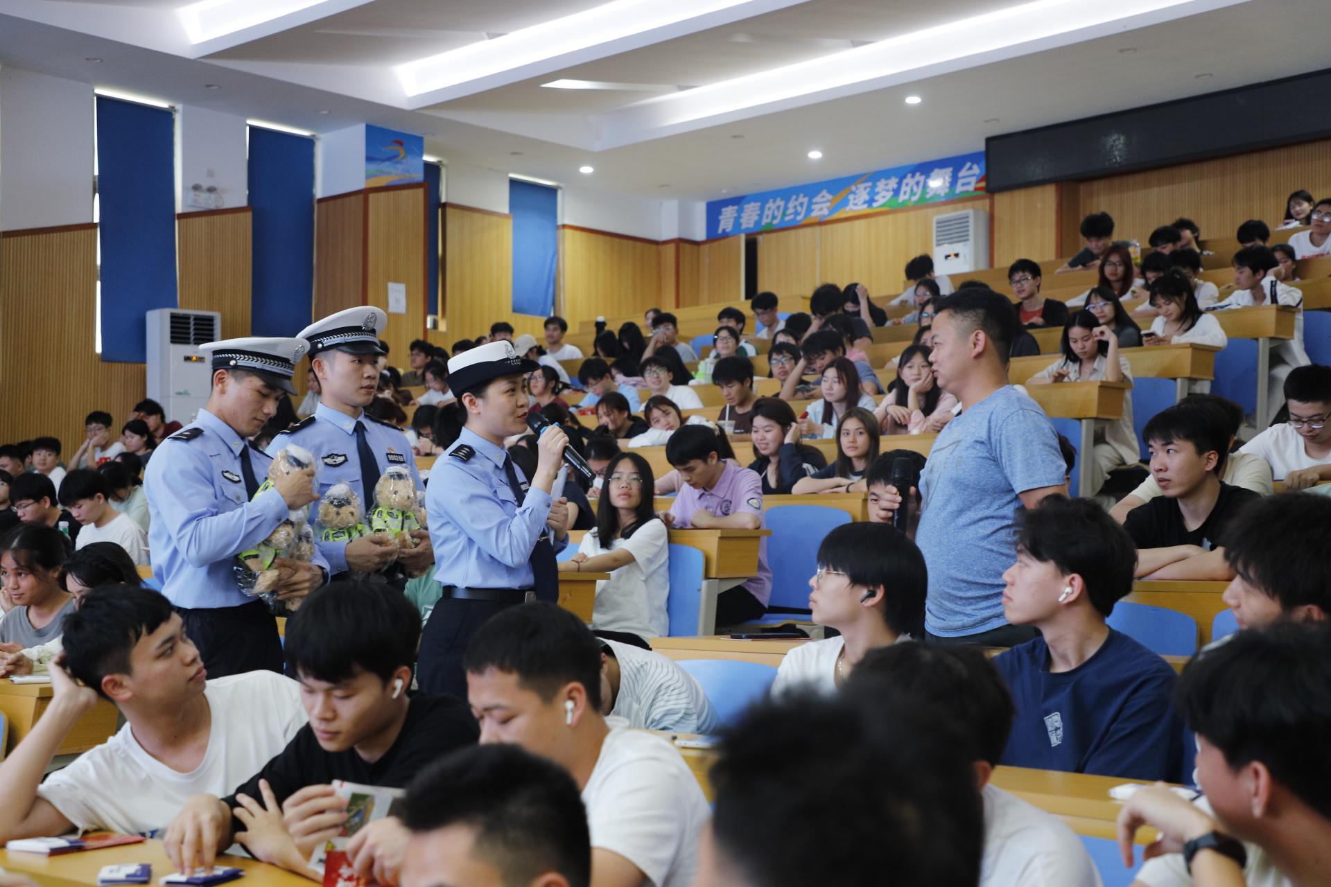 主讲人崔文琪中队长在讲座中介绍了常见的交通违法行为,同时结合辖区交通现状和典型事故案例,以通俗易懂的语言向同学们生动地介绍了当前道路交通安全形势,深入浅出地讲解了超速、疲劳驾驶、酒后驾车、非紧急情况在高速公路行车道或应急车道内停车、违法载客等机动车交通违法行为及危害。活动期间,民警何冬莹带领同学们进行了“交通安全知识快问快答竞赛”,通过沉浸式的游戏互动,让同学们更加深入了解交通安全知识。同学们踊跃答题,现场气氛活跃,每个回答正确的同学都得到了“警察小熊”奖品,进一步激发了同学们学交规、懂文明、知安全的学习热情。在讲座的尾声,民警现场解答了学生们的提问。