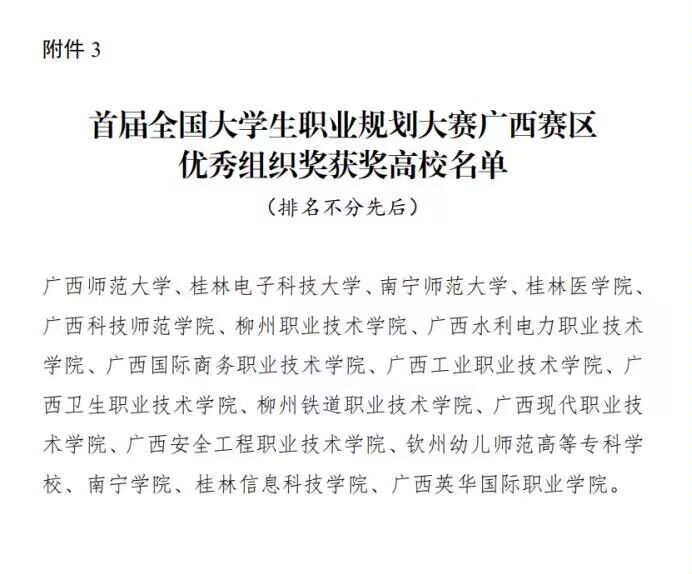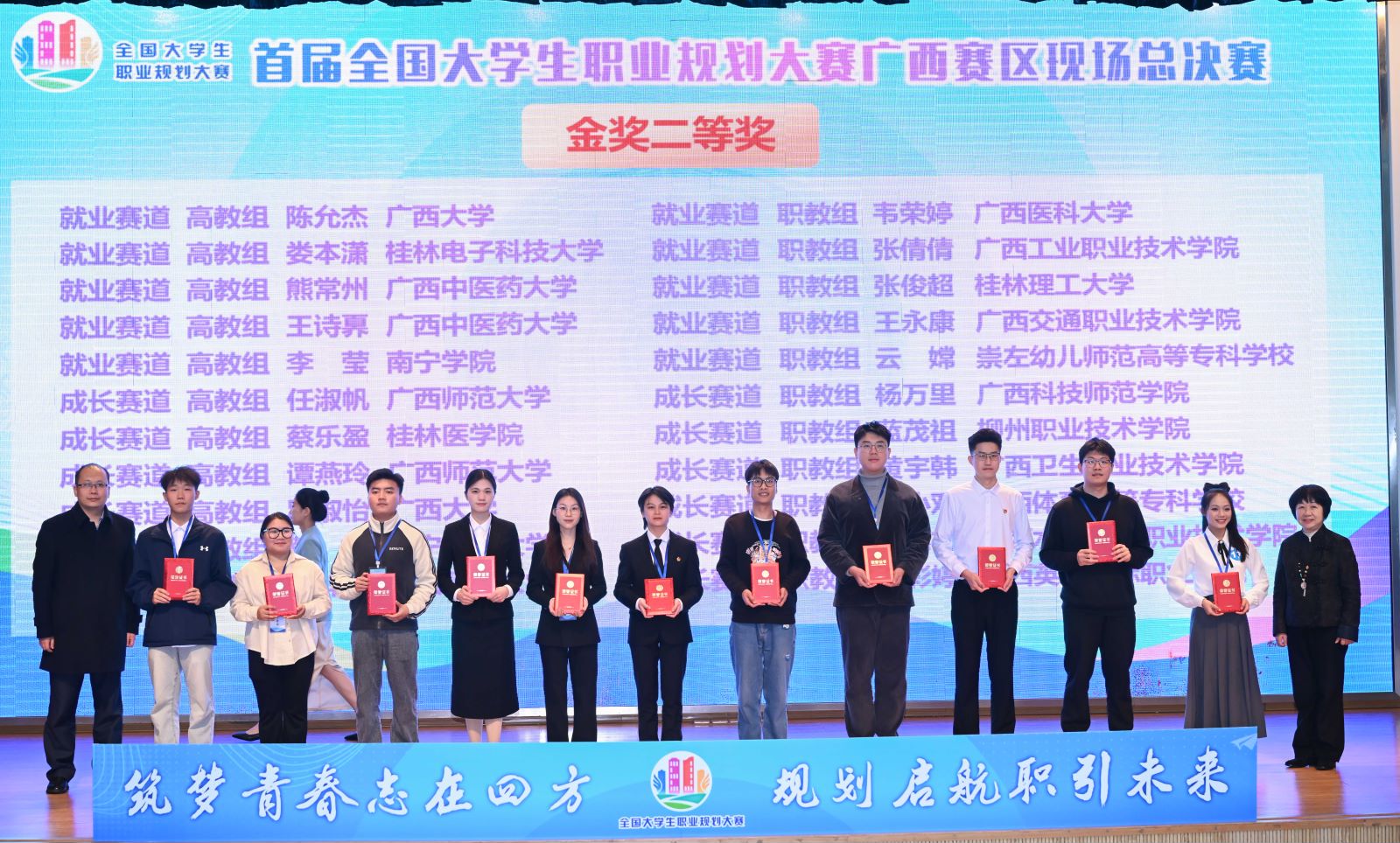 根据《自治区教育厅关于公布首届全国大学生职业规划大赛广西赛区获奖名单的通知》(桂教学生〔2024〕8号)传来喜报,南宁学院选送18名选手分别参加高教组、职教组的就业赛道、成长赛道,共收获4个区赛金奖、5个银奖、9个铜奖,学校获“优秀组织奖”。