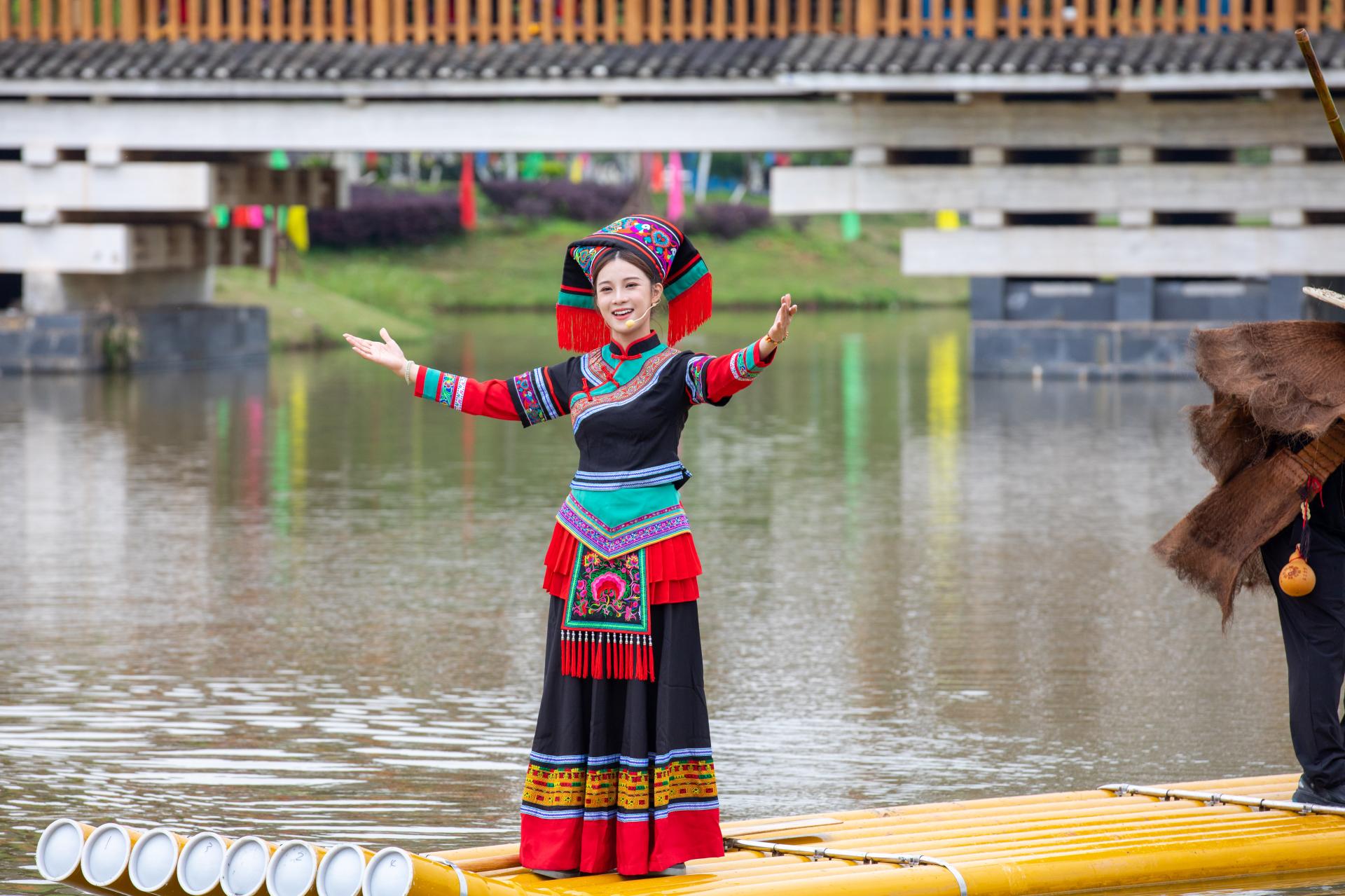 临近傍晚的不孤湖畔,欢歌萦绕,热闹非凡。伴随着熟悉的旋律,南院版“印象·刘三姐”随后在此上演。演出由学校教育学院黄钰善老师扮演的“刘三姐”从青秀风雨桥下乘竹筏驶出开始,以《山歌好比春江水》一曲唱响不孤湖中央。其后由两百余名学校不同年龄、不同地区、不同民族的表演者组成的民族歌阵,齐声唱响代表着广西三月三的耳熟能详的民族歌曲《广西尼的呀》《三姐的歌万人和》,生动展现了“壮族三月三”歌圩盛况。“我上春山约你来见,邀你一起驰骋跃马扬鞭,青春无限正好扬帆,前路灿灿在南院……”南院版《上春山》展示了师生的美好愿景。现场欢歌飞扬,激情回荡。表演最后,现场观众一起挥舞手中的国旗,引吭高歌,合唱《歌唱祖国》,用歌声表达对伟大祖国繁荣昌盛的美好祝愿,将会场活动推向高潮。