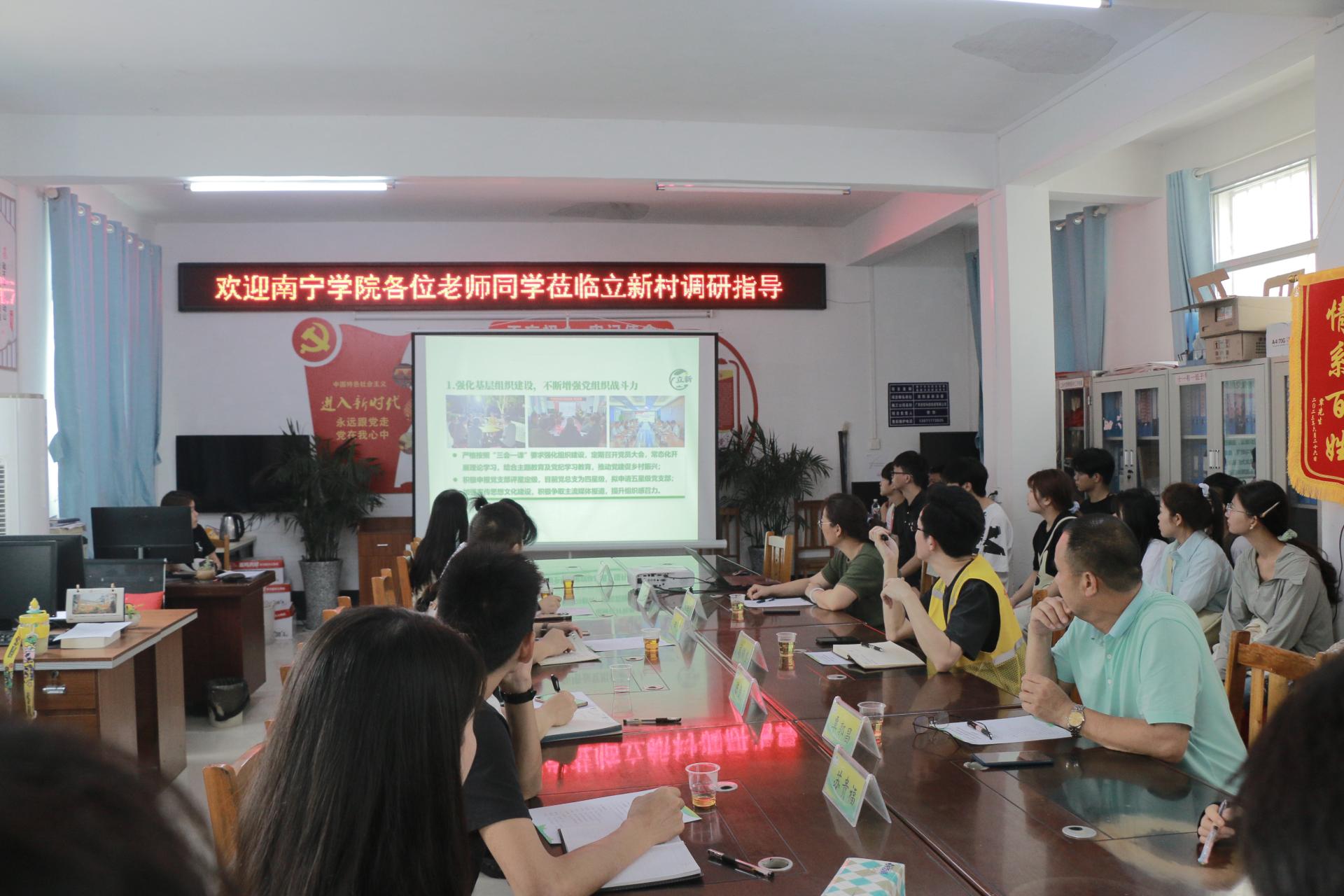 师生乘坐大巴到达新桥镇立新村,受到村委的热情接待,通过观看村委制作的宣传视频,熟悉了立新村概况。紧接着,立新村驻村第一书记高锦奎介绍立新村的发展现状和当前重点工作,让参加研学活动的师生实地了解立新村在乡村振兴中的努力方向和成果。