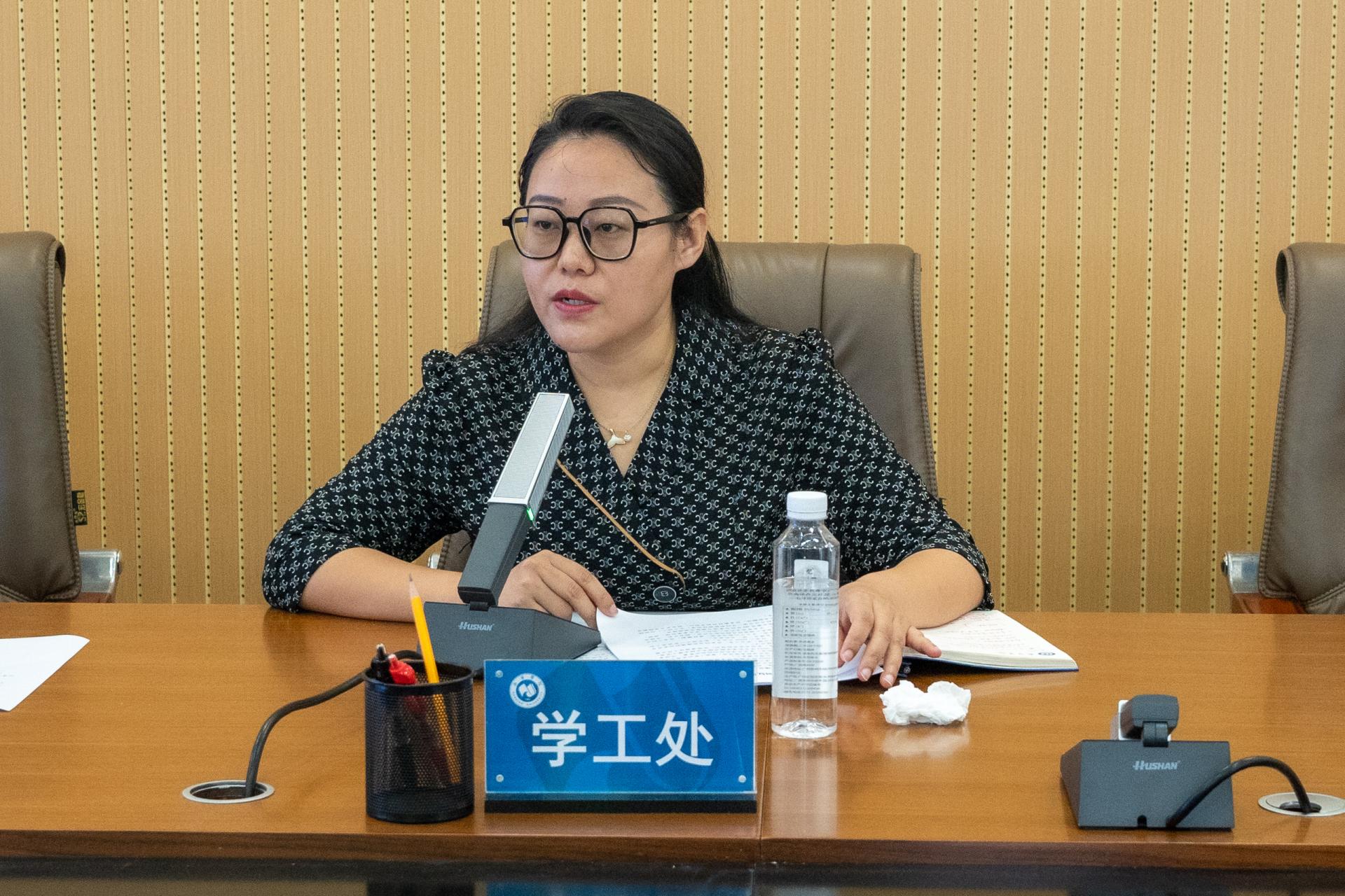 王静静处长在会上紧扣学校近期学生工作特点,深入剖析学校现阶段学生工作中仍存在的问题,围绕以“学生发展为中心”的教育理念,研讨现阶段学生成长和发展过程中各单位部门应形成合力的重点举措,形成多方位联动、多资源聚合的整体效应,打好校内“组合拳”,实现三全育人。学院分管学生工作书记、副书记也在会上做了简要交流。