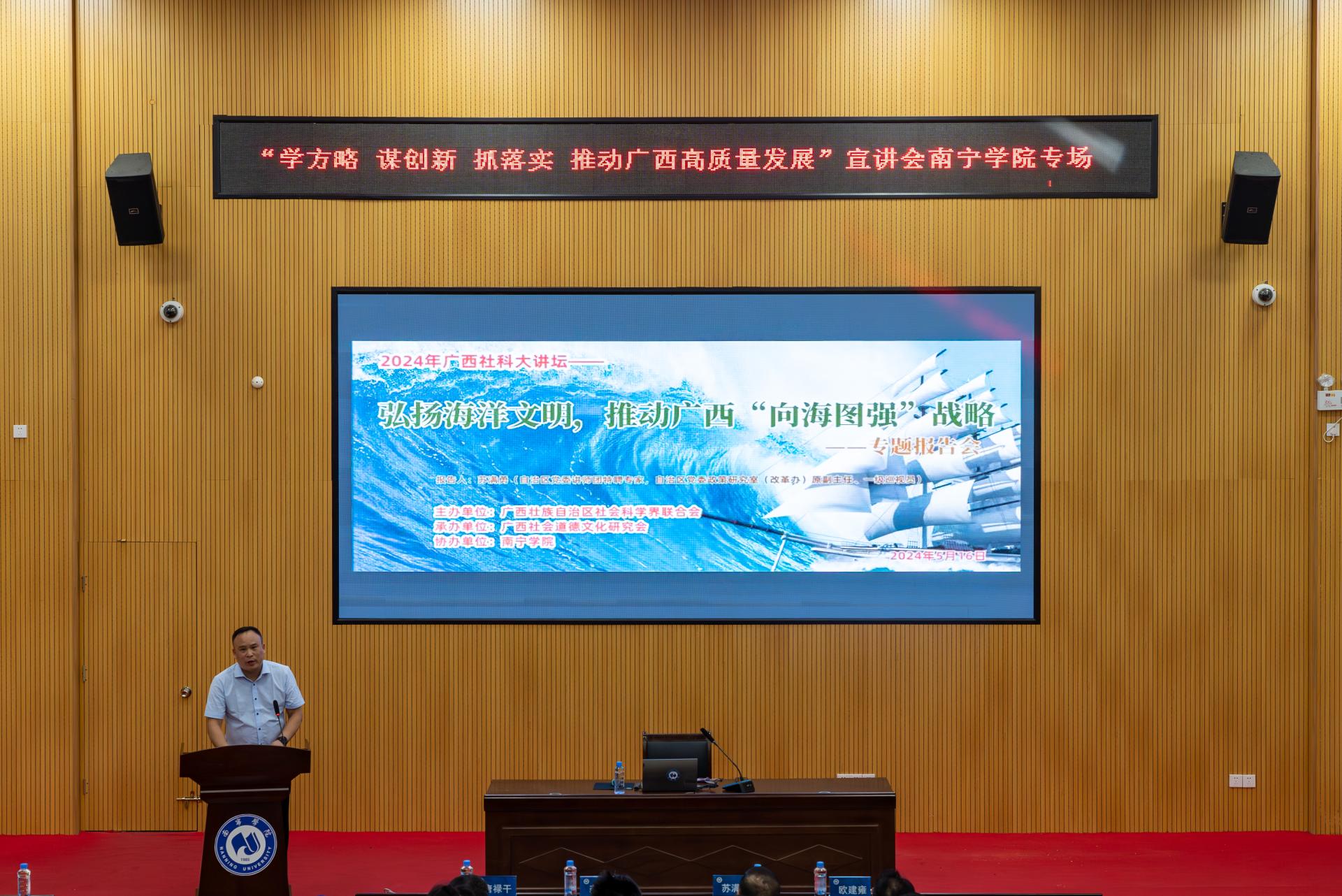 为深入贯彻落实习近平总书记对广西工作的重要指示精神,持续推动学习向海图强的战略指向和实践要求。5月16日,广西社会道德文化研究会在2024年广西社会科学普及活动周期间,邀请自治区党委讲师团特聘教授、市一级巡视员苏满勇教授到我校开展广西社会科学大讲坛活动,学校副校长龚击主持会议。