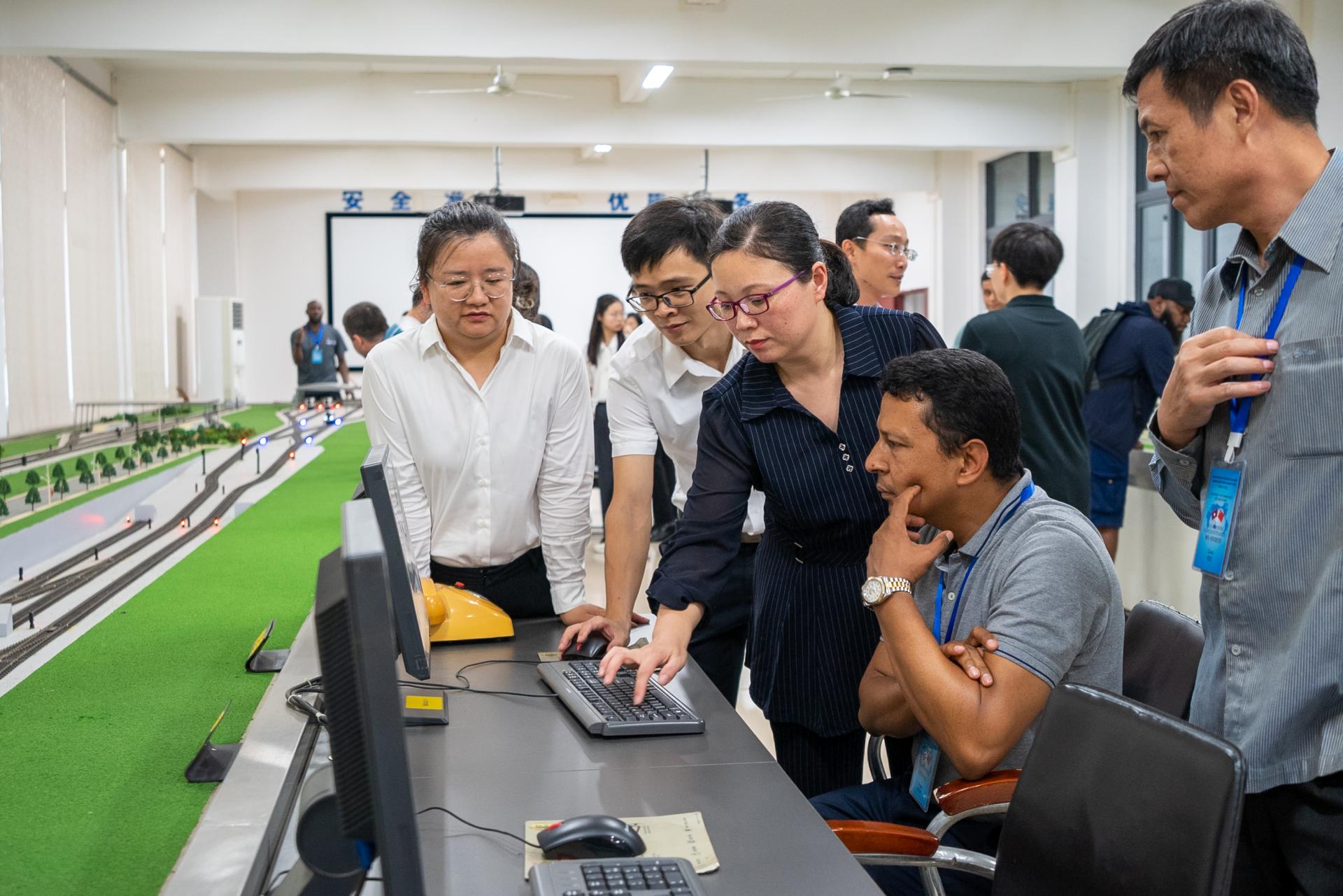 20日下午,在庞彦知副教授、商洁老师的陪同下研修班官员前往重点实验室,参观列车驾驶操控实验室、轨道信号基础实验室、轨道交通运行与控制实验实训中心并进行了实操训练,研修班各国官员对重点实验室专业设备和实践实训场地给予了高度评价,期望有更多的来我校深度学习交流的机会。