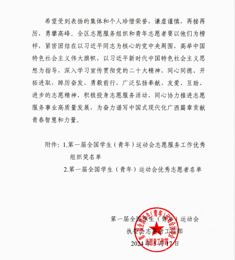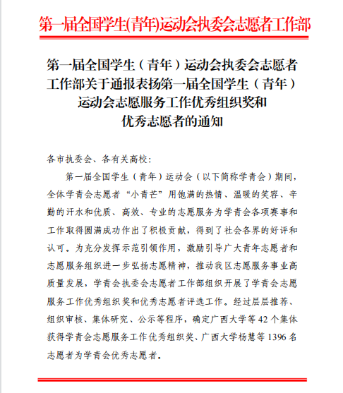 5月23日,我校收到第一届全国学生(青年)运动会执委会志愿者工作部通报表扬文件,南宁学院荣获第一届全国学生(青年)运动会志愿服务工作优秀组织奖,梁锦韵、赵志林、李家茂等17名学子荣获优秀志愿者称号。此举是对我校及志愿者在运动会中的表现给予了充分的肯定。