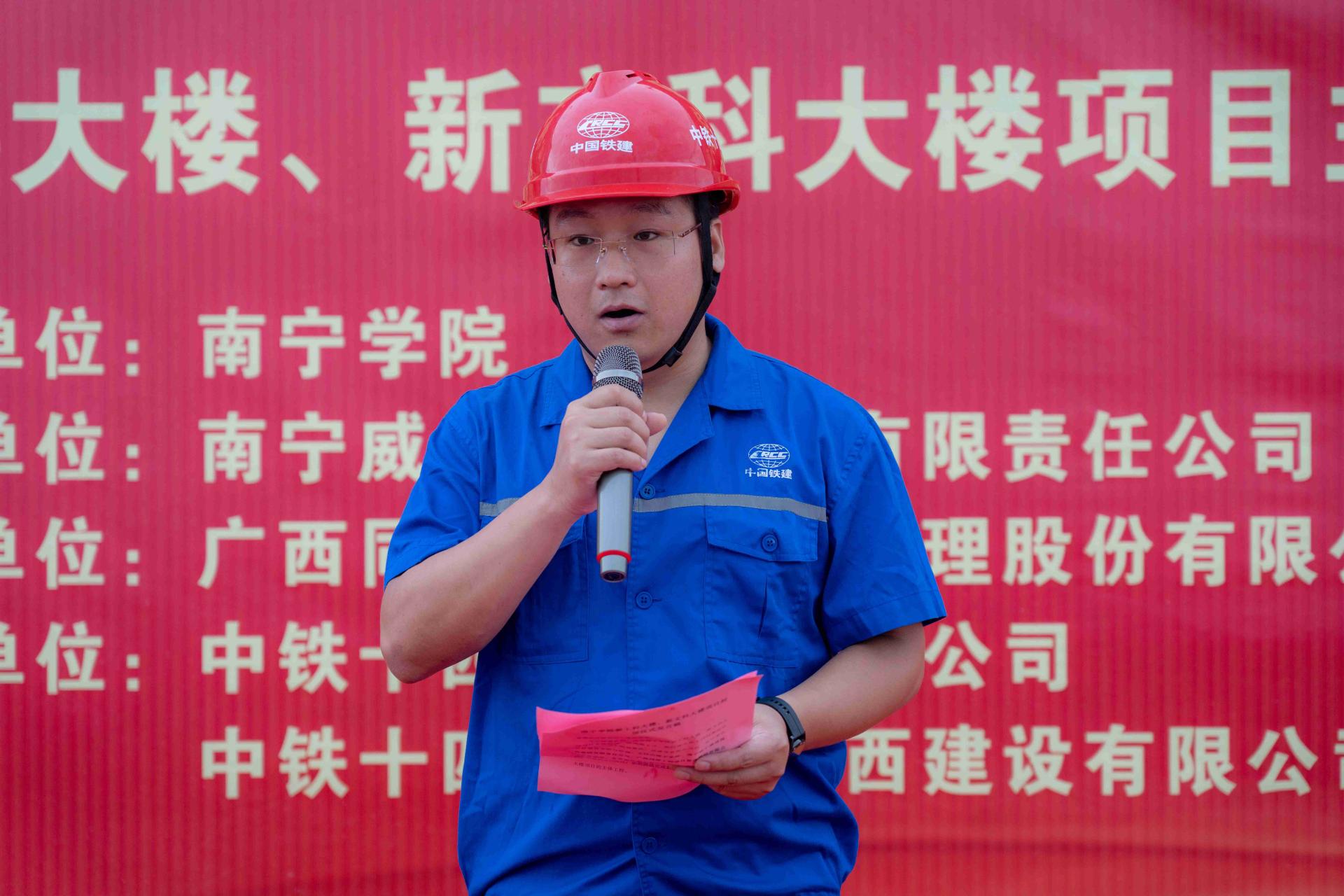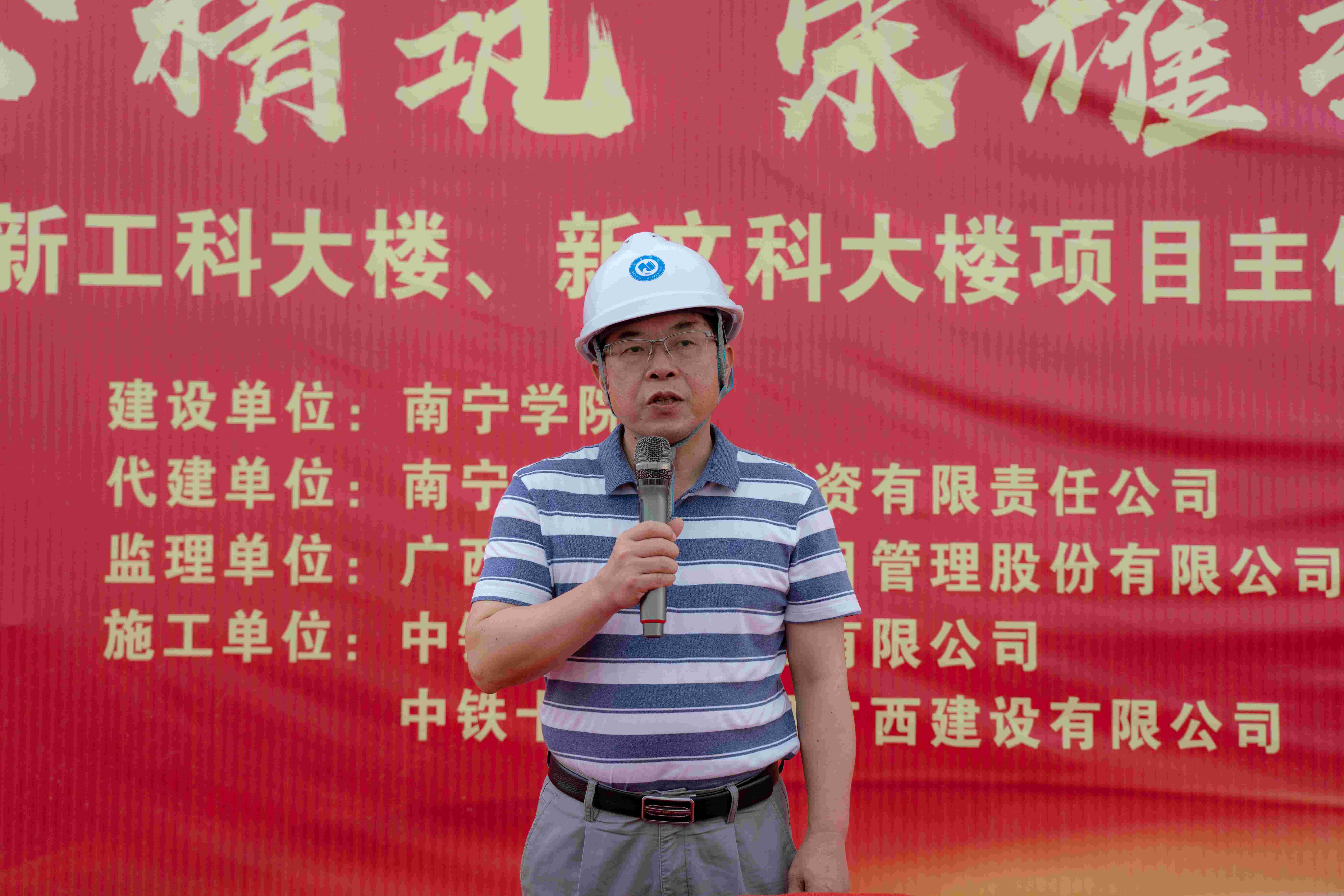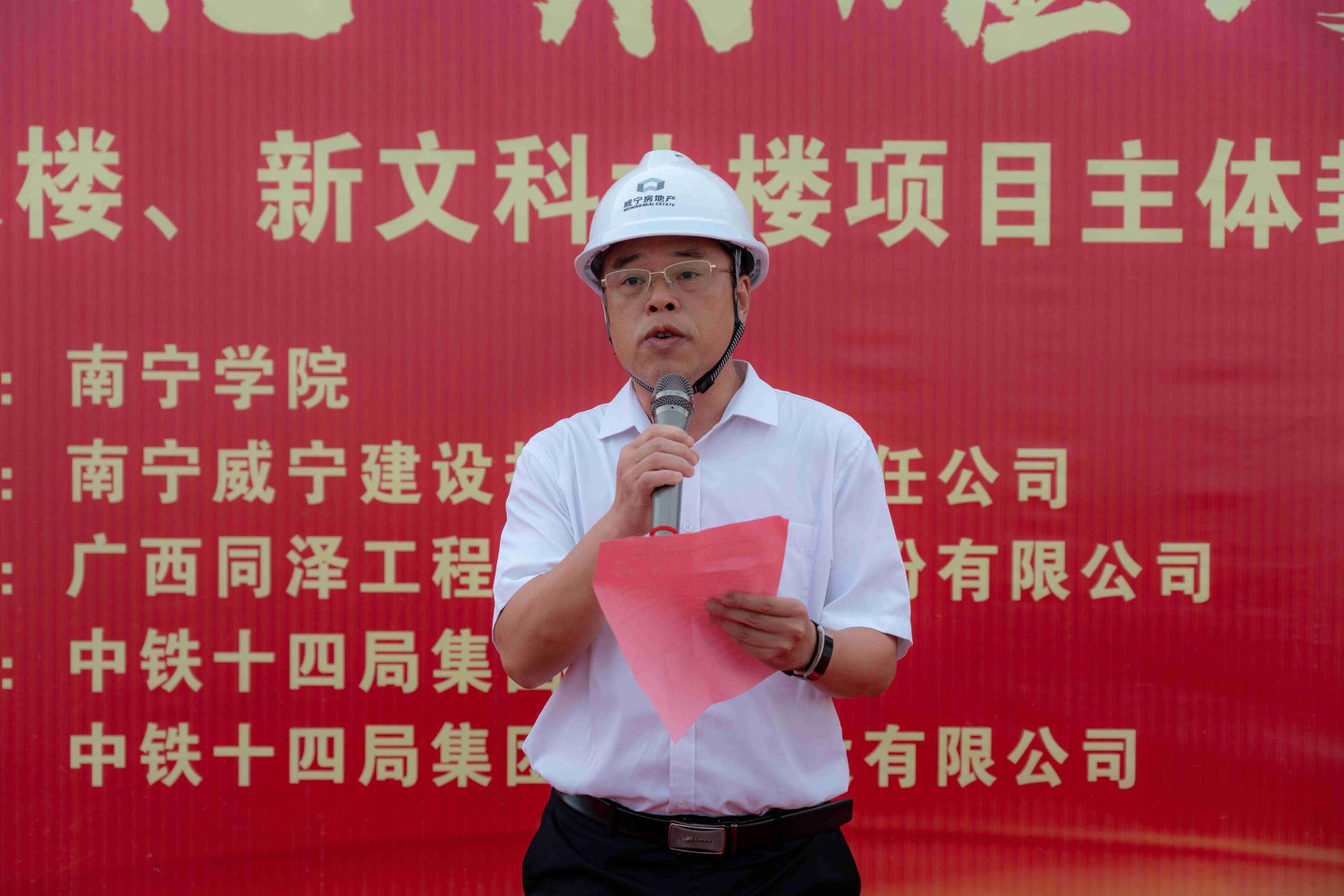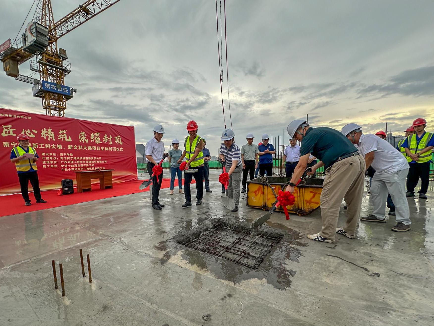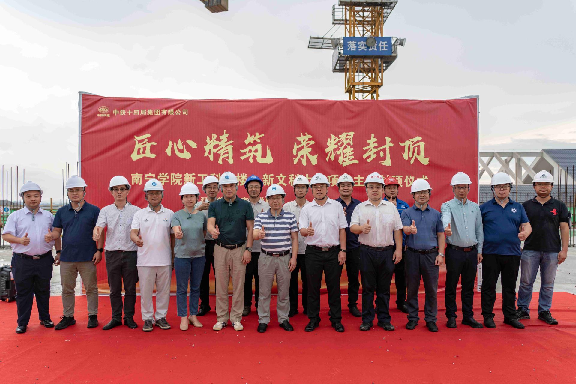 6月27日下午,学校举行新工科大楼、新文科大楼项目主体封顶仪式。学校党委书记刘彪、副校长龚击、学校相关职能部门负责人、南宁威宁房地产开发集团有限公司副总经理何继军、南宁威宁建设投资有限责任公司总经理林积淞、广西同泽工程项目管理股份有限公司南宁学院项目总监苏华、中铁十四局集团有限公司广西经营负责人李洪普以及劳务、专业分包等参建各方代表参加封顶仪式。