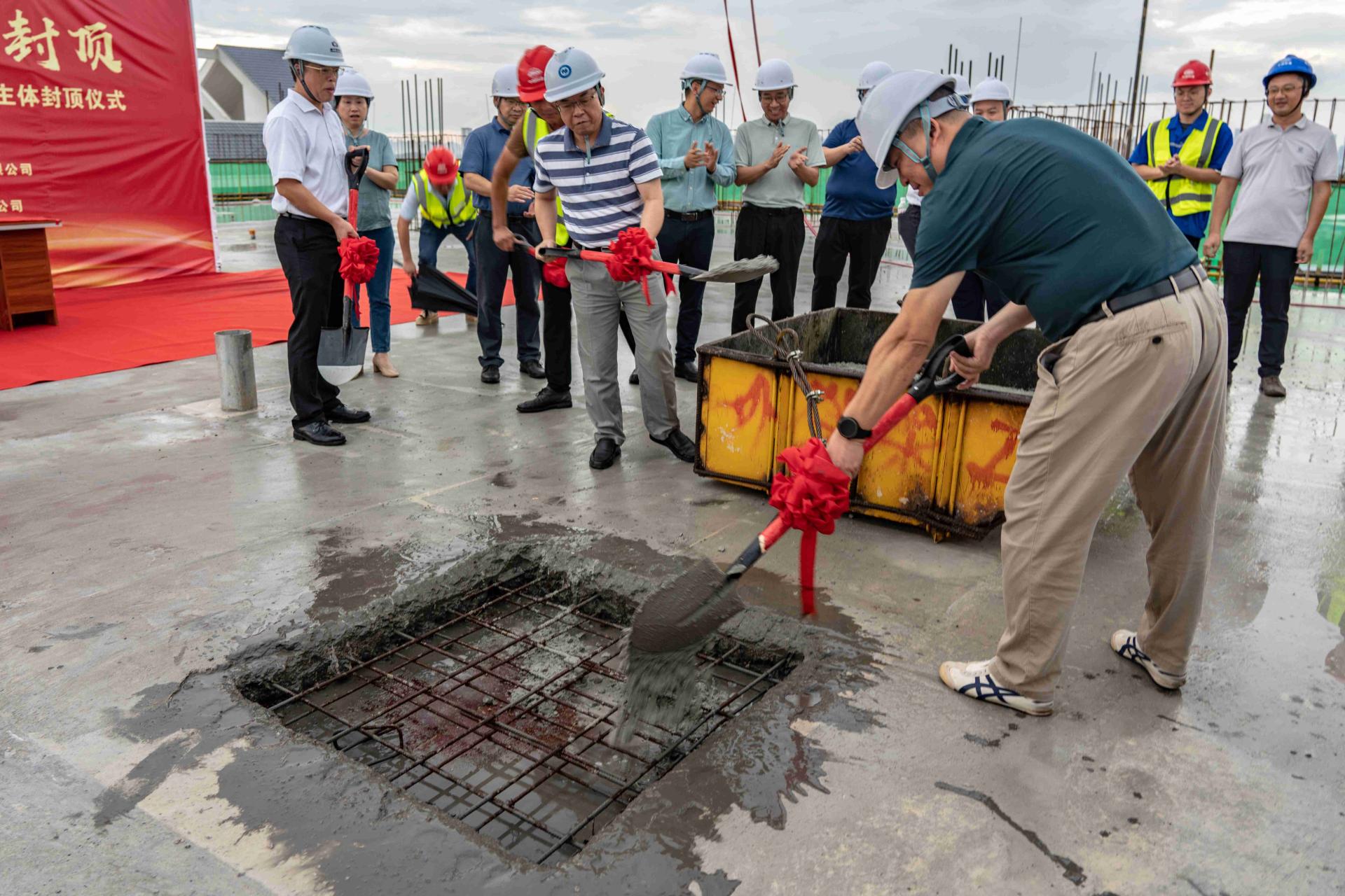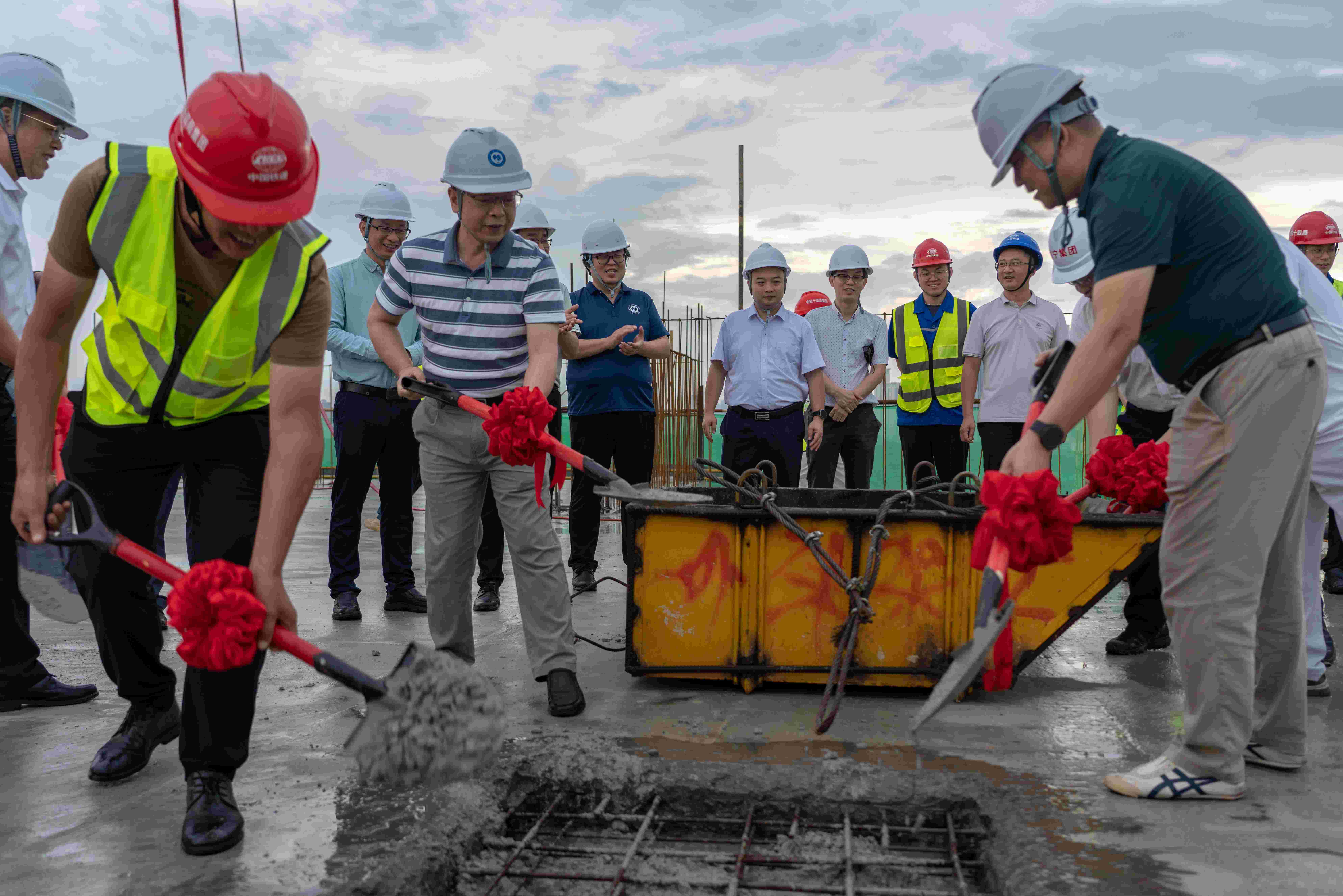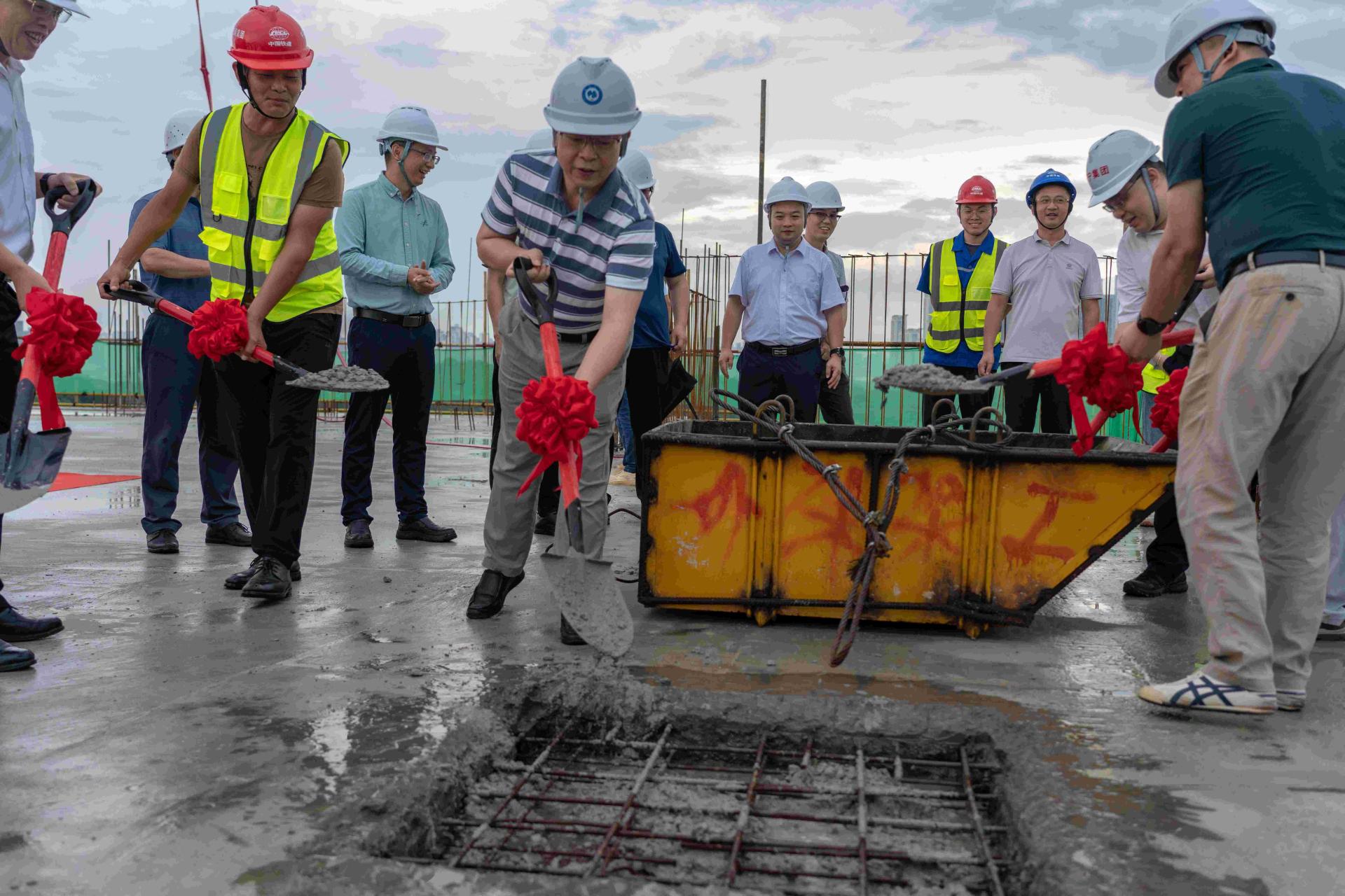 刘彪书记、龚击副校长和参与仪式人员共同浇筑最后一块混凝土