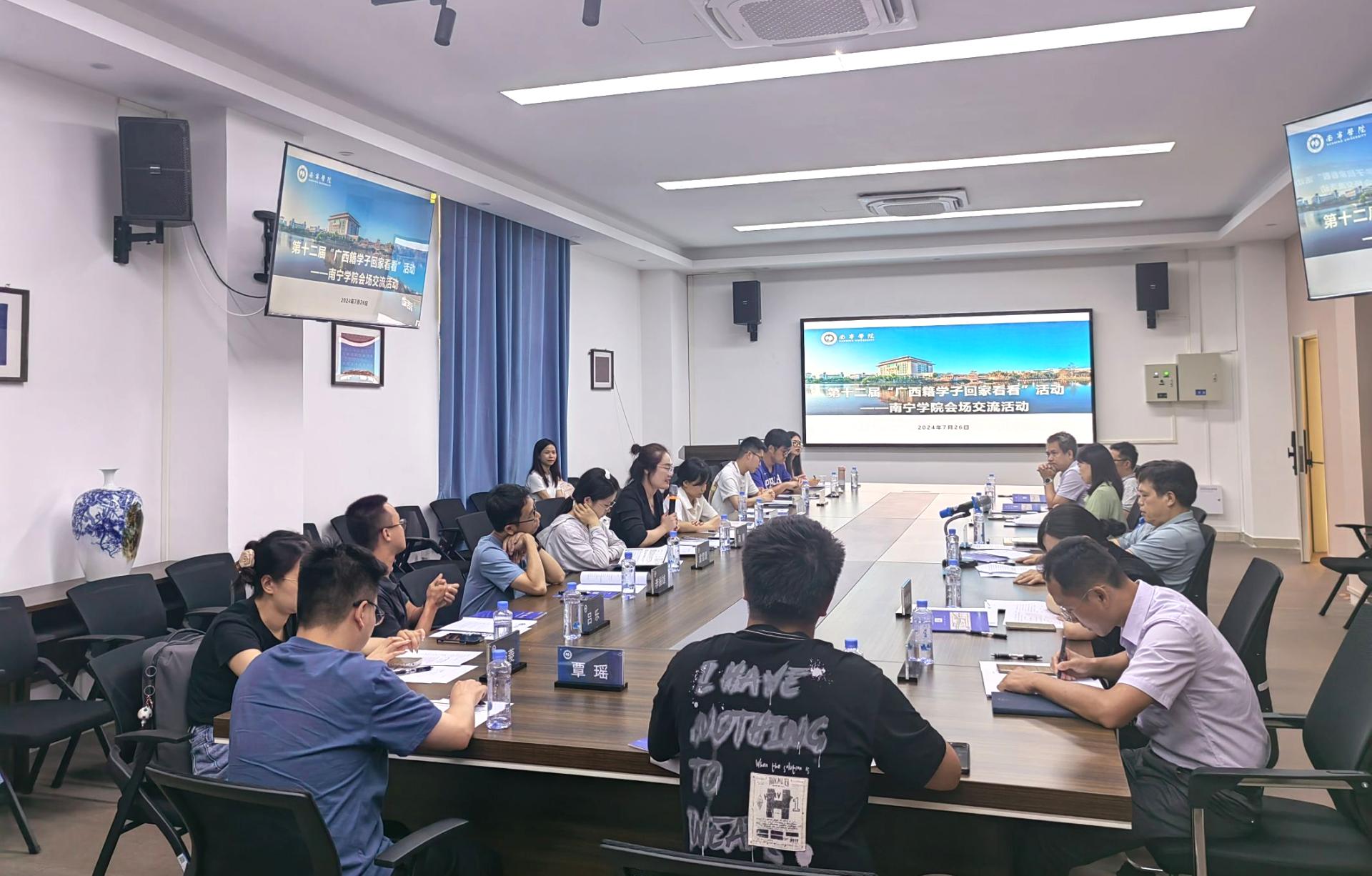 7月26日下午,根据南宁市委组织部、市委宣传部等单位主办的第十二届“广西籍学子回家看看”活动安排,在南宁北部湾人才金港有限公司副总经理魏娜带队下,广西籍博士生代表团共19人到我校参观交流。交流座谈会在综合楼111会议室举行,副校长李陶深、副校长王宁章及人事处、科研与学科建设处、智能制造学院、交通运输学院、商学院等单位负责人出席座谈会。会议由王宁章副校长主持。