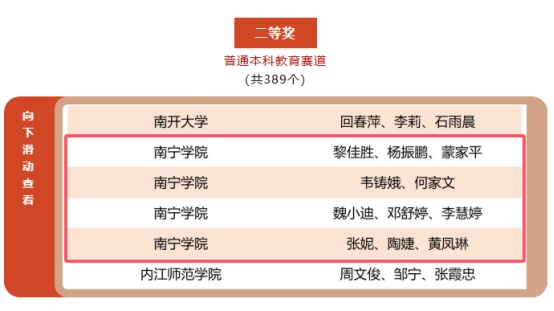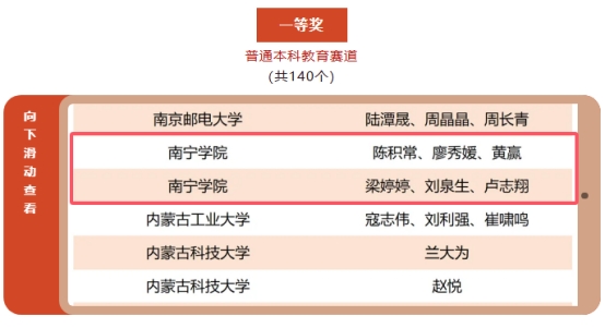 我校信息工程学院陈积常、人工智能与软件学院梁婷婷2个参赛教师团队获一等奖(普通本科赛道)。信息工程学院黎佳胜韦铸娥、魏小迪,东盟学院张妮,4个参赛教师团队获二等奖(普通本科赛道)。南宁学院获“最佳组织奖”荣誉称号。