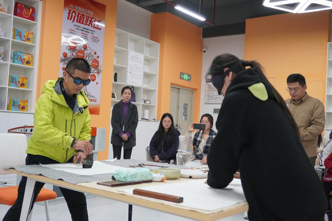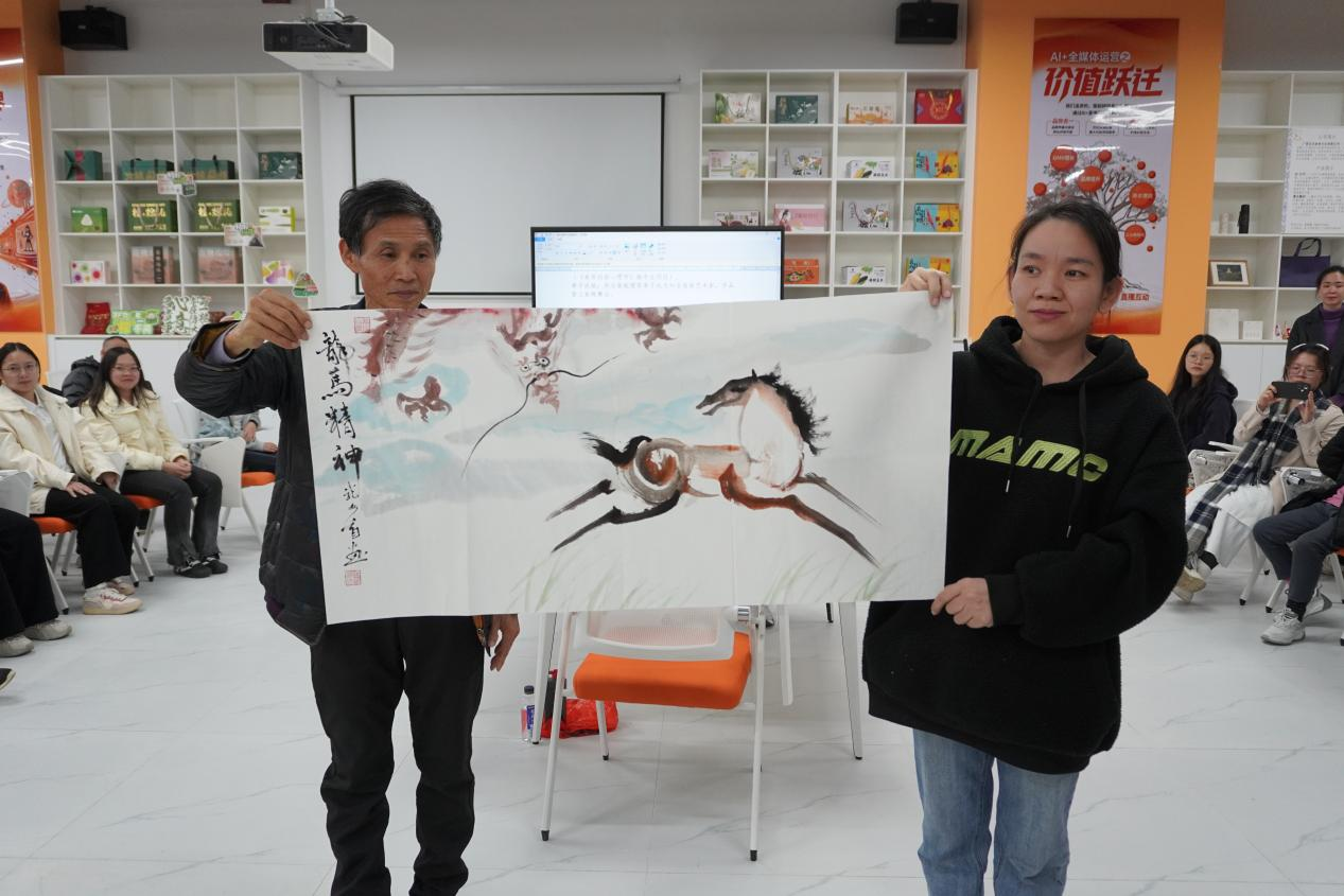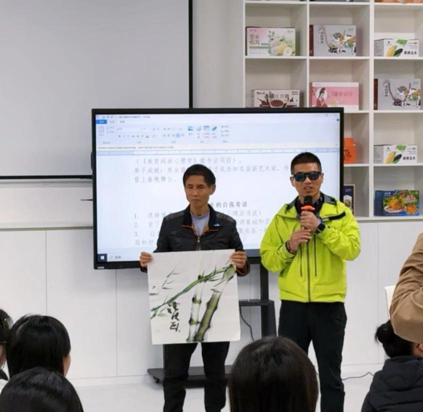 活动现场,曾老师的弟子,盲人艺术家张洪创作了“竹”画并分享了他的故事:作为亚洲首位、世界第三位登顶珠峰的盲人登山者,他失明后以攀登的毅力探索盲画创作,通过触摸竹节纹理、聆听竹叶风声绘就盲画《竹》,用作品诠释出“心有光明,万物皆可入画”的信念。曾老师收养的女儿,盲画小龙女曾毓珺也现场创作了盲画《龙马精神》,小龙女曾毓珺是聋哑视障孤儿,1996年跟随养父著名书画家曾老师学习盲画,绘画是视觉艺术,但她用行动颠覆了三维的认知,创作出一大批优秀的盲画作品。2008年她为北京奥运会和残奥会创作的2008厘米盲画《奥运群英图》,被奥委会收藏。盲画作品多次在广西艺术学院美术馆、德国、英国、日本、美国、中国香港、上海刘海粟美术馆等地展出。中央电视台、《澳门日报》、中国新闻社等十几家媒体报道她的事迹,让众人真切感受到“残障从不是梦想的边界”。曾老师“盲于目而不盲于心”的教学理念,让参会学生党员深刻体会到“把群众需求放在首位”的党员本色。