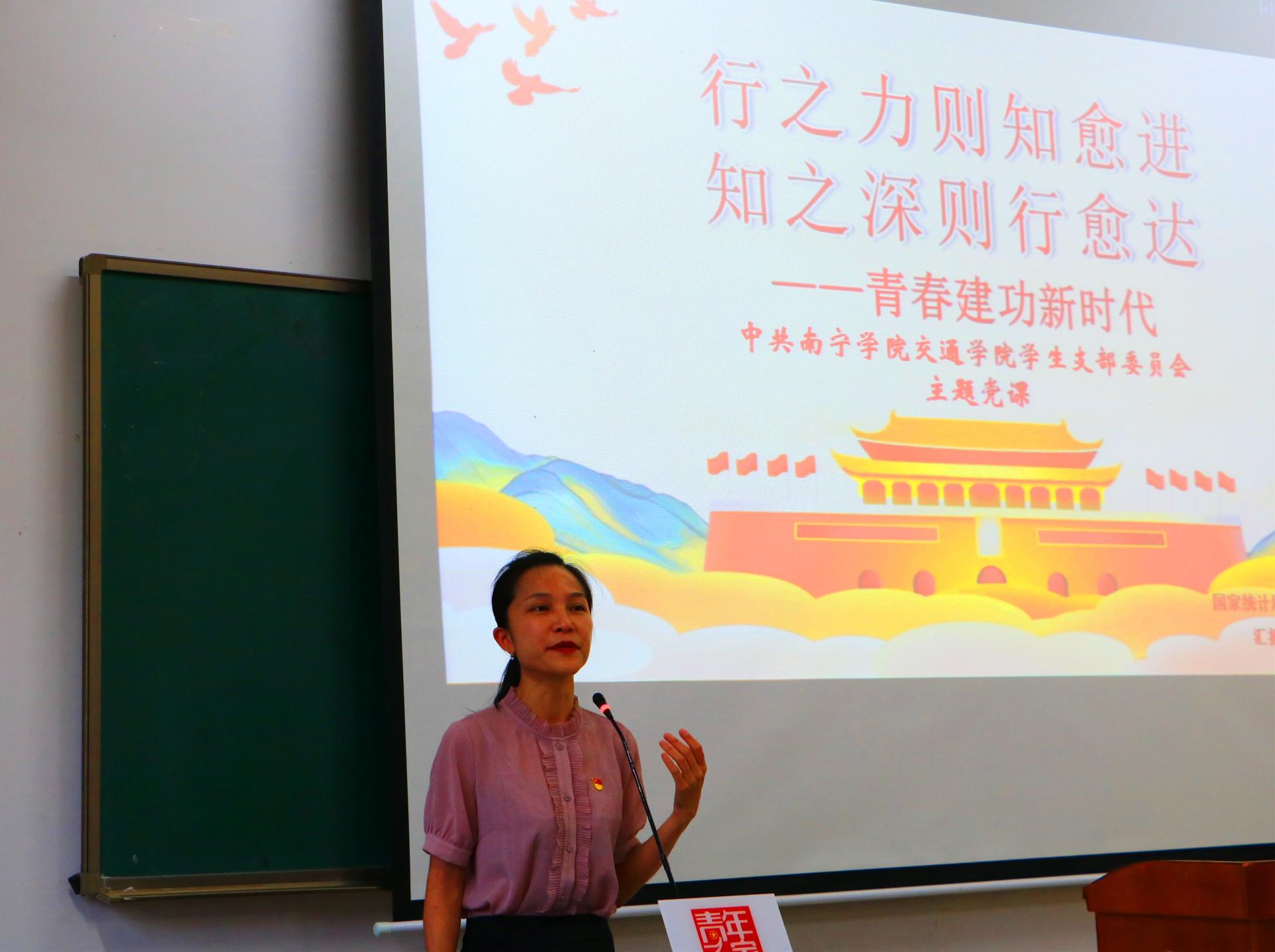为加强学生党员队伍的思想政治理念建设,鼓励党员传承红色基因,勇担时代使命,让即将走向工作岗位的毕业生党员学有所思,不负韶华,发挥好党员先锋模范作用,于2021年6月24日,在敷文园B101交通学院党总支邀请支部共建单位国家统计局南宁调查队党支部李静妮队长以“行之力则知愈进,知之深则行愈达——青春建功新时代”为主题在毕业之际给交通学院毕业生党员上一堂党课。