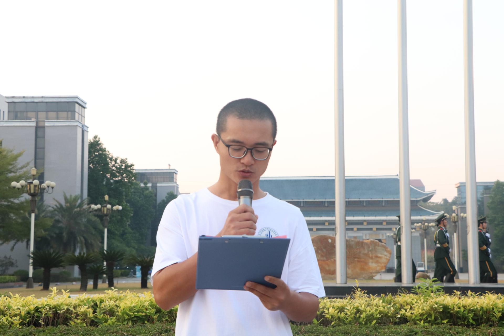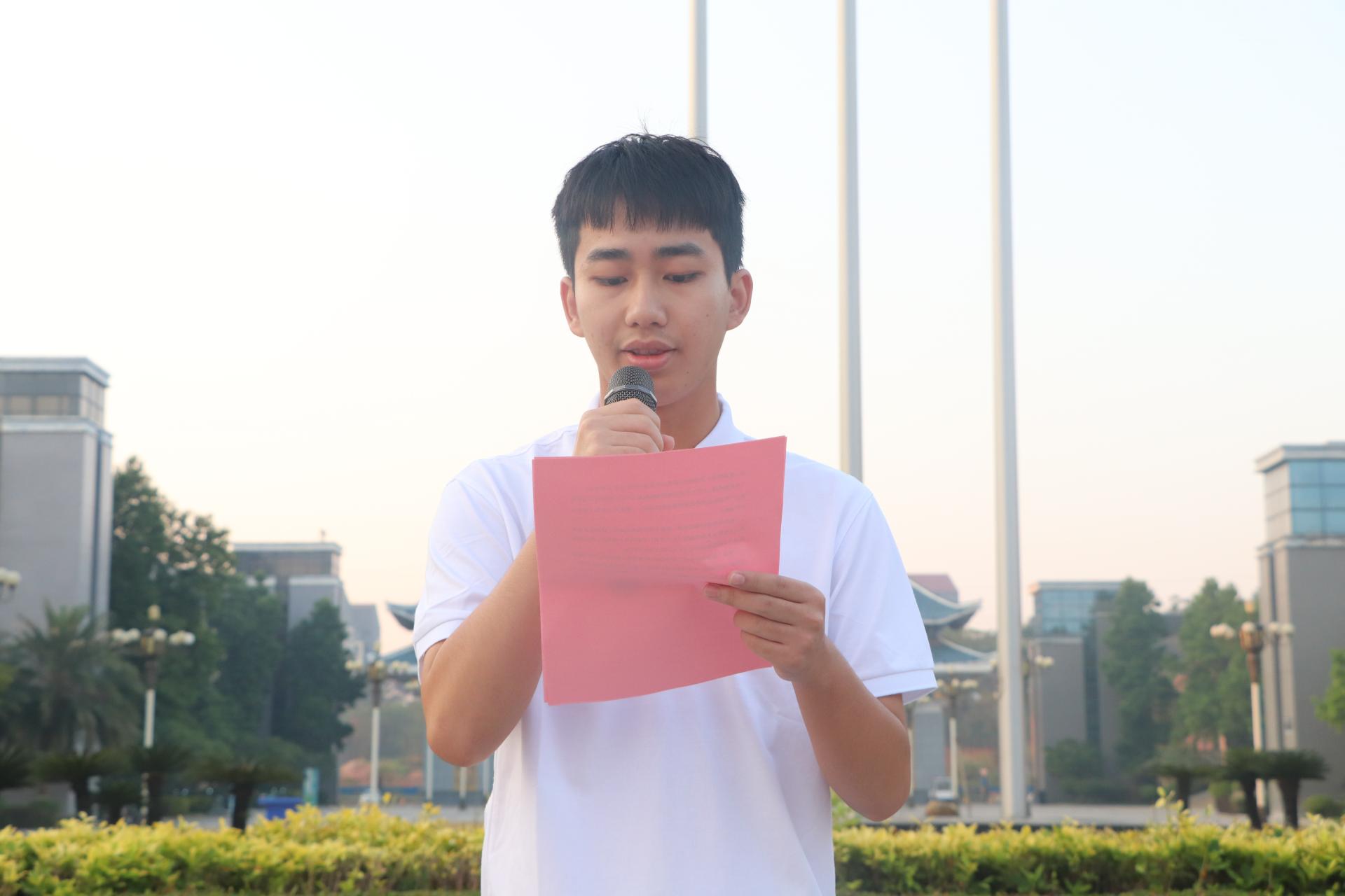 随着国旗护卫队的进场,升旗仪式正式开始,英姿飒爽的国旗护卫队队员迈着铿锵有力、整齐划一的步伐,护卫着鲜红的国旗和崭新的校旗走到升旗台,全场肃立,《义勇军进行曲》在广场响起,五星红旗缓缓升起迎风飘扬,紧接着校旗在欢快的校歌声中也徐徐升起。随后,2022级学生代表潘豪在国旗下作“砥砺奋进跟党走,青春献礼二十大”的主题讲话,他以党的二十大精神为引,呼吁同学们“胸怀祖国、志存高远、心怀感恩、甘于奉献”,在这个大时代下抓住机遇,努力做出“无愧于历史、无愧于人民、无愧于时代”的成绩。