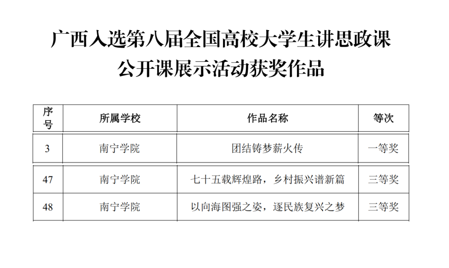 近日,第八届全国高校大学生讲思政课公开课展示活动和大学生微电影展示活动获奖名单公布,我校推荐参赛的三项大学生讲思政课公开课作品均荣获国赛奖项,再次展现了南宁学院学子积极向上的青春风貌,彰显了学校立德树人的成效。
