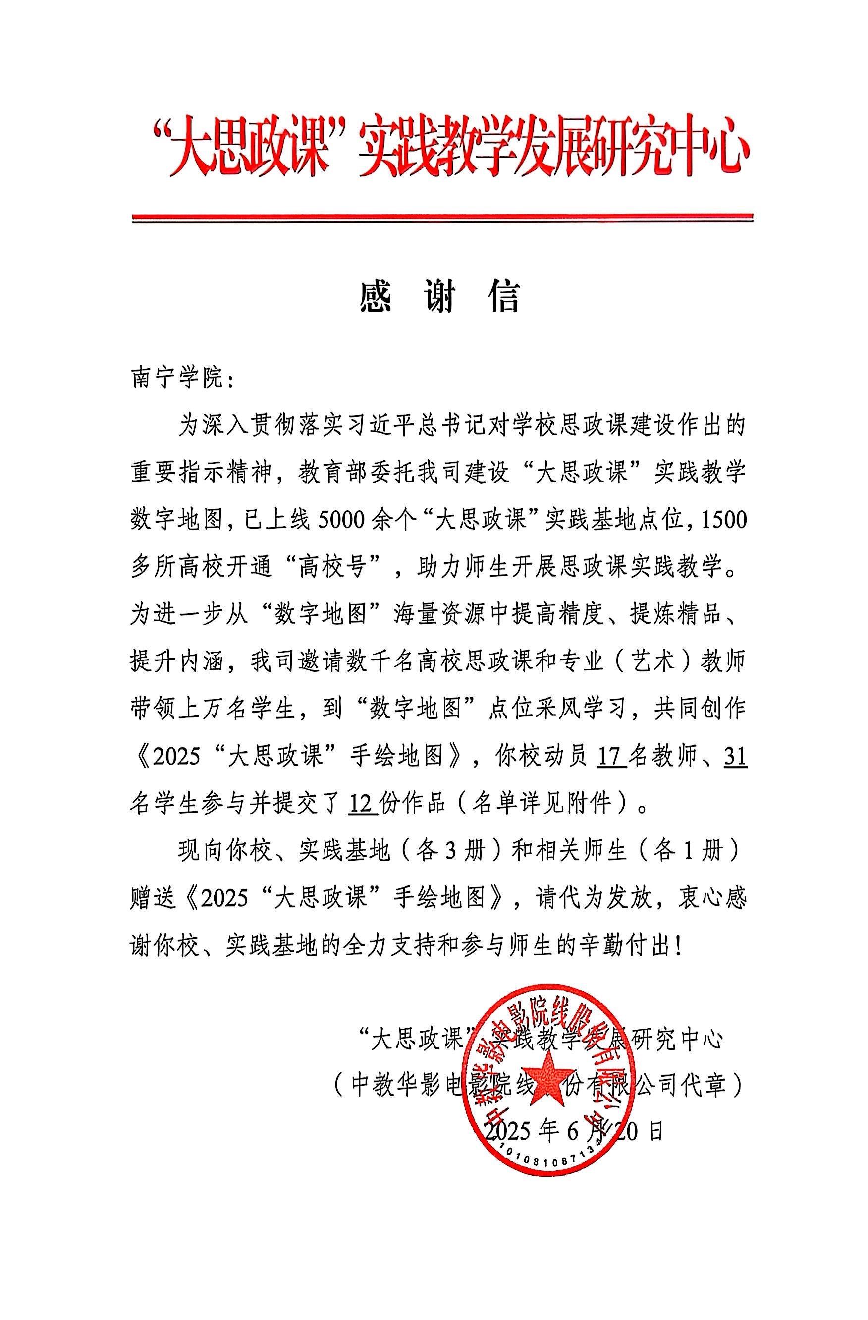 近日,教育部“大思政课”实践教学发展研究中心公布《2025“大思政课”手绘地图》入选名单,学校思政课师生团队联合“广西民族博物馆”“良庆区盘龙社区党群服务中心”等实践教学基地制作的实践资源在全国2000余件作品中脱颖而出,成功入选《2025“大思政课”手绘地图》项目。入选资源包括17名“大思政课”育人教师、31名学生参与提交的12份作品,其中包含广西“向海图强”系列手绘地图作品及《团结筑梦薪火传——探寻壮乡民族团结的文化根脉》《奏响中华民族“交往曲”,绘就民族团结“同心圆”》等实践教学资源作品。