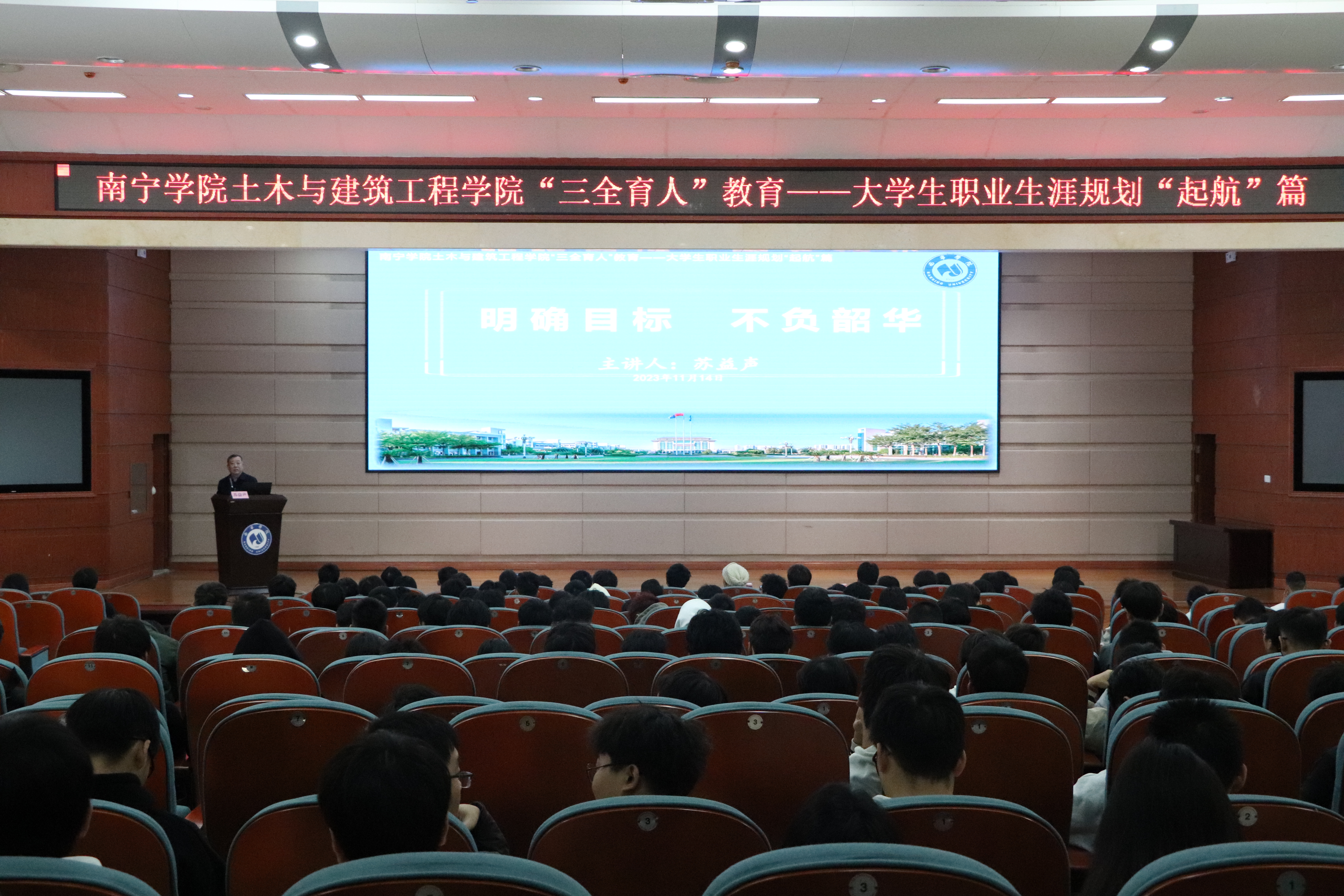 土木与建筑工程学院在校党委的亲切指导和关怀下,今年6月获批南宁学院“三全育人”示范院以来,尝试构建“全员”育人格局,打造“全过程”育人机制,将学生的培养分为“起航、护航、远航”三个阶段。为帮助2023级新生更好地明确学习目标,科学有效规划大学学习生活。我院于11月14日下午在图书馆报告厅举行了一场关于“三全育人”教育—大学生职业生涯规划“起航篇”之明确目标、不负韶华的专题讲座。主讲嘉宾为土木与建筑工程学院原院长苏益声教授,参与本次讲座的有学院党委副书记赵娟,学生科负责人杨璐老师,学工科辅导员老师和专业老师及2023级部分新生。
