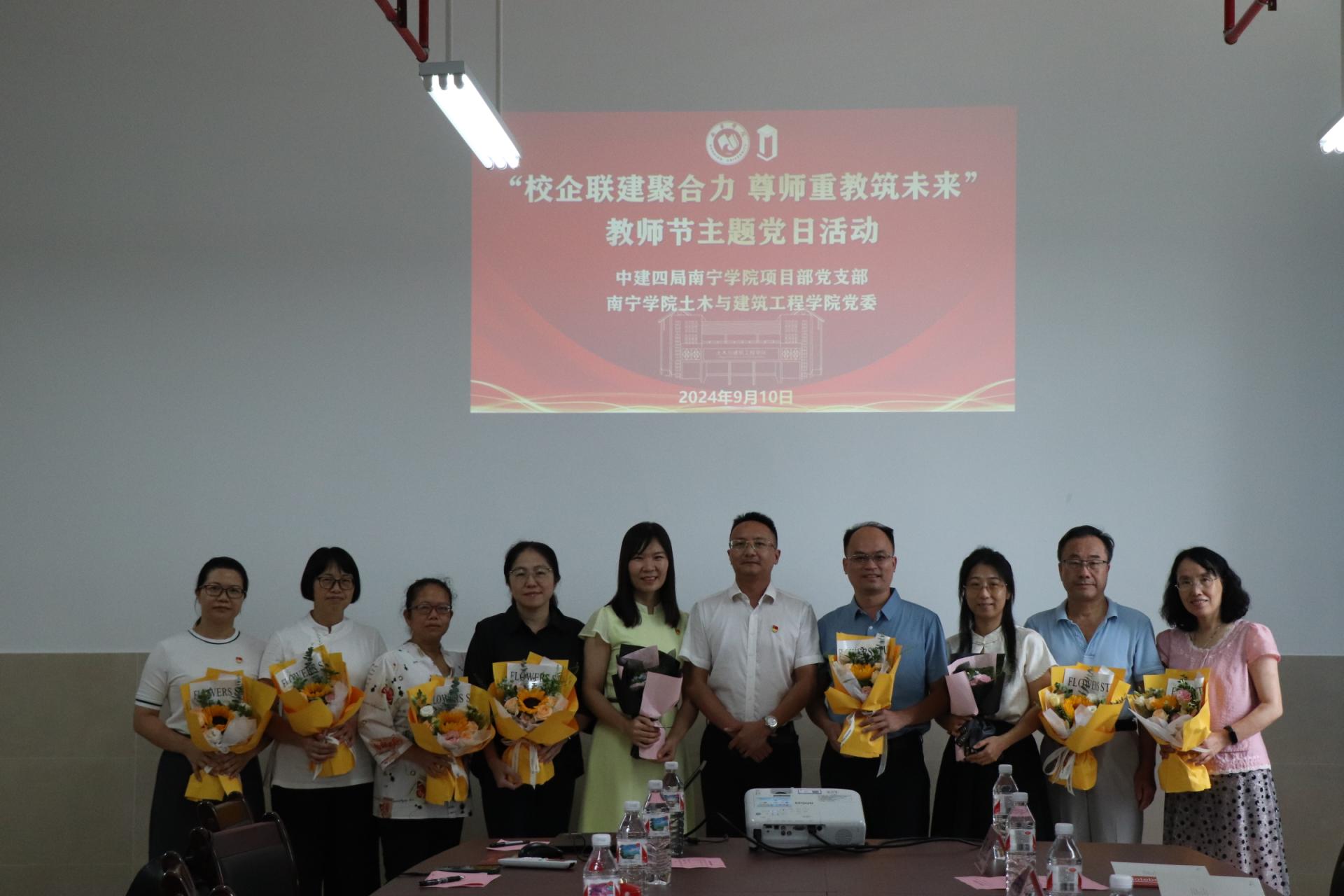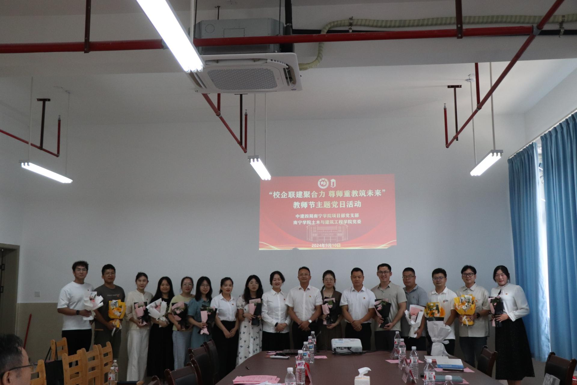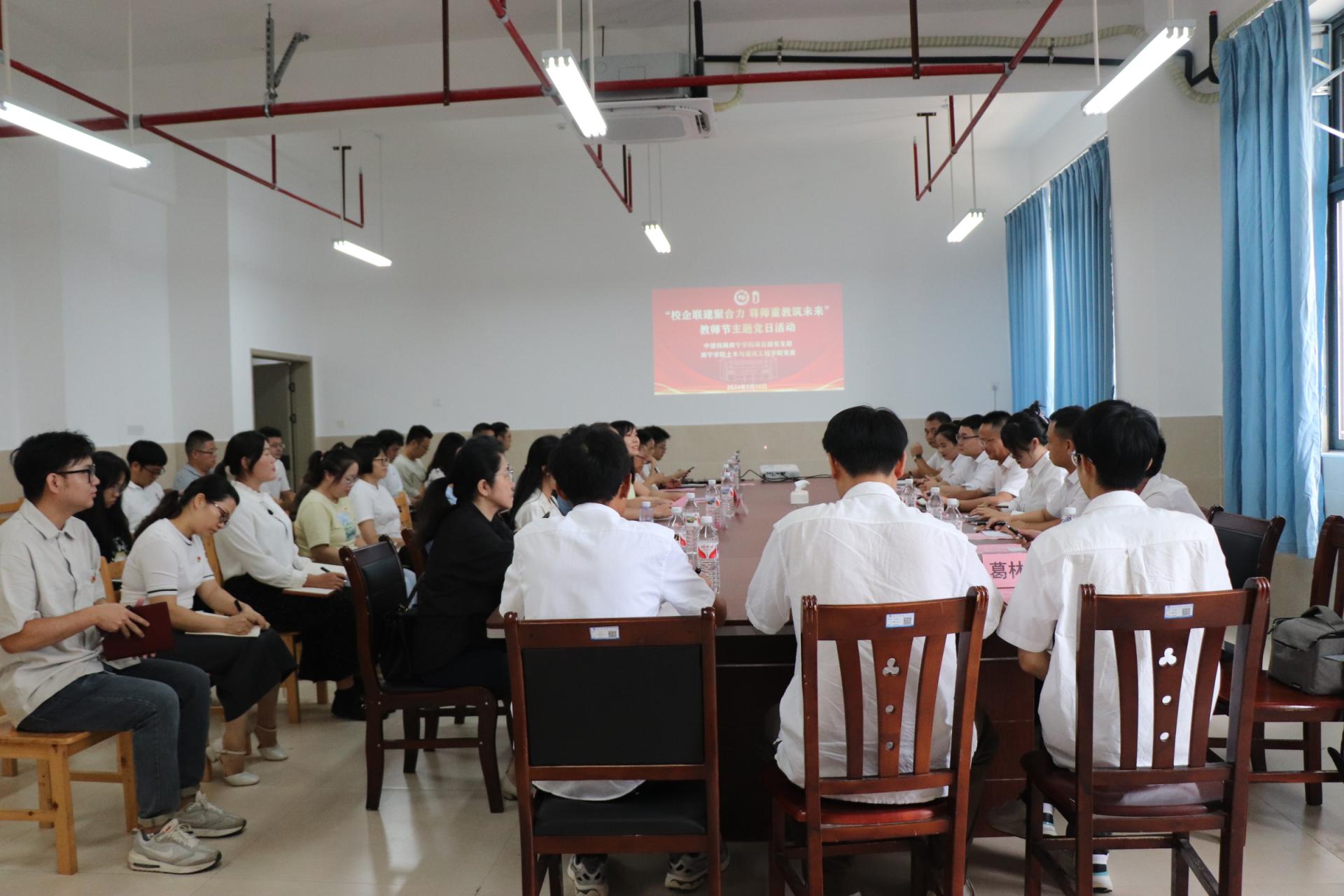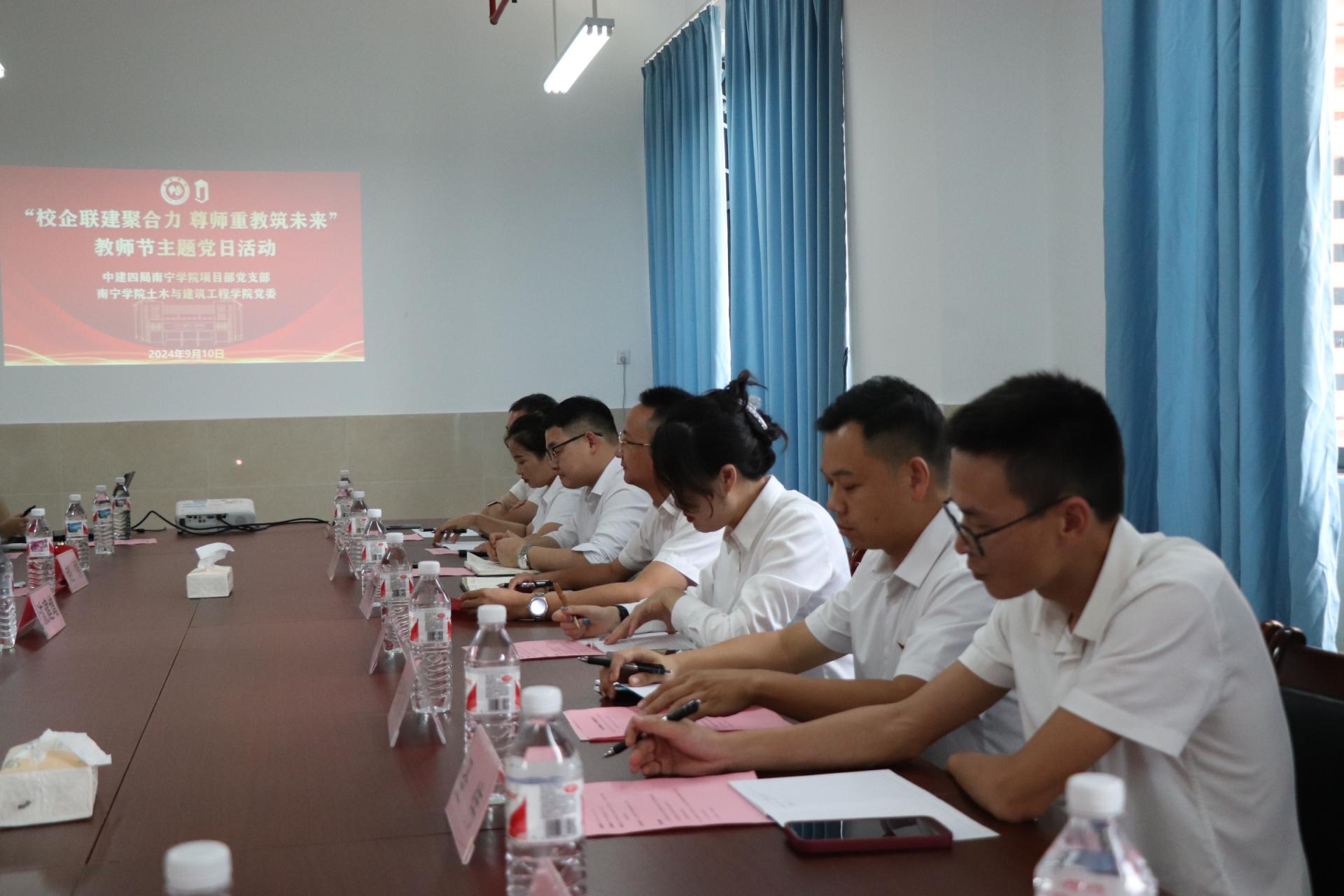 “四十载育桃李,一片丹心谱华章”,为庆祝全国第40个教师节,进一步传承和发扬尊师重教的优良传统,9月10日上午,中建四局南宁学院项目部党支部和南宁学院土木与建筑工程学院党委在南宁学院东盟实验大楼 A707会议室联合开展“校企联建聚合力 尊师重教筑未来”教师节主题党日活动。该活动由土木与建筑工程学院党委副书记赵娟主持,参会人员有中建四局南宁学院项目党支部代表、土木与建筑工程学院党员教师代表。