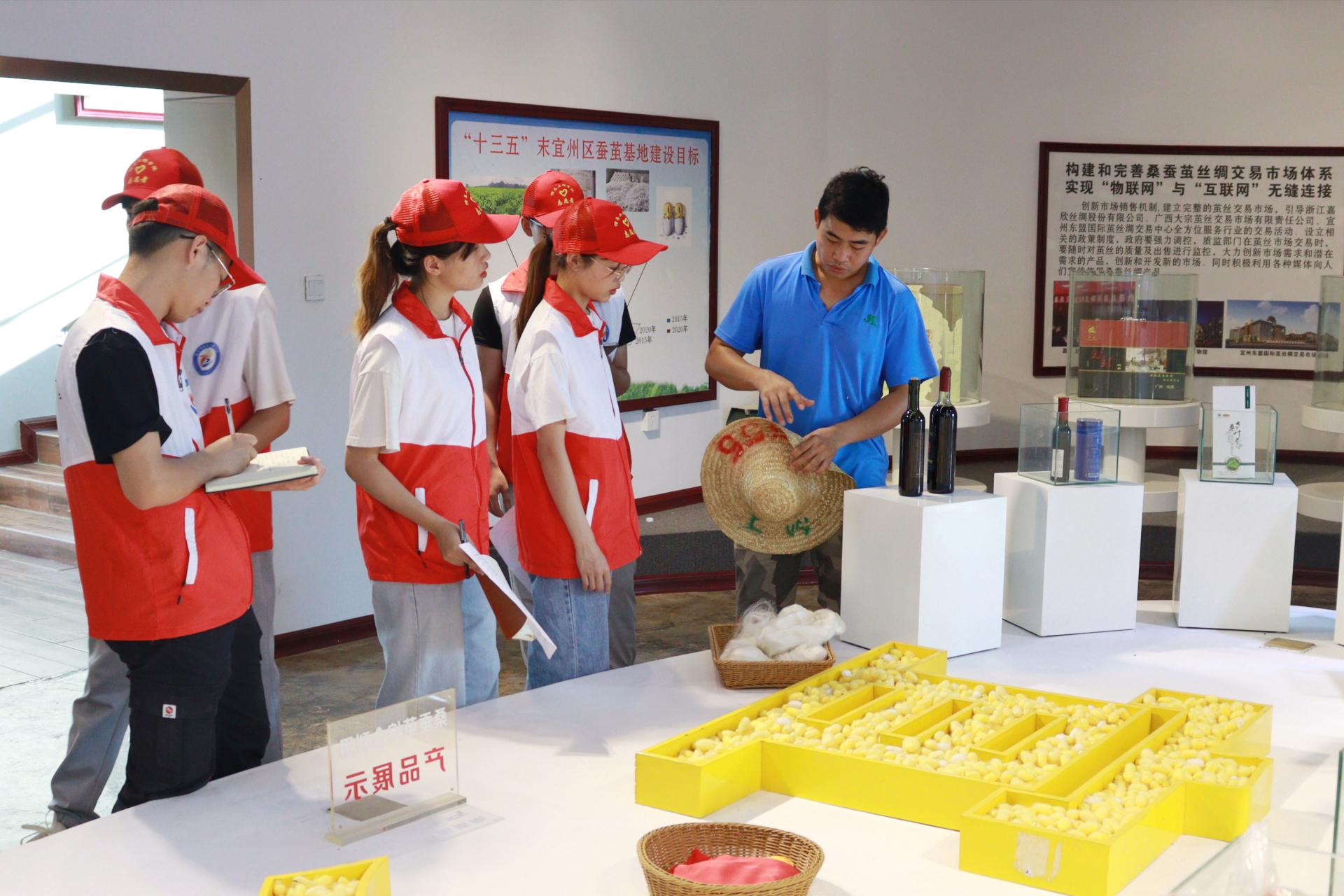 赋能实践团在基地负责人带领下,通过参观讲解,与上坪村农户交谈下地实践考察,让我们对当地乡村振兴产业的了解。上坪村是以产业带动农村发展,桑蚕资源全利用——蚕茧可以加工成蚕丝外,蚕沙可以加工成有机肥,桑葚可生产桑葚酒等。国家扶持、企业扶持等为农民提供了政策福利条件,利用旅游与种桑养蚕相结合发展模式,开展广西宜州刘三姐桑蚕丝绸文化展示旅游业,带动了该地区种桑养蚕业的快速发展,增加了农民的收入,农民生活质量水平总体提升。