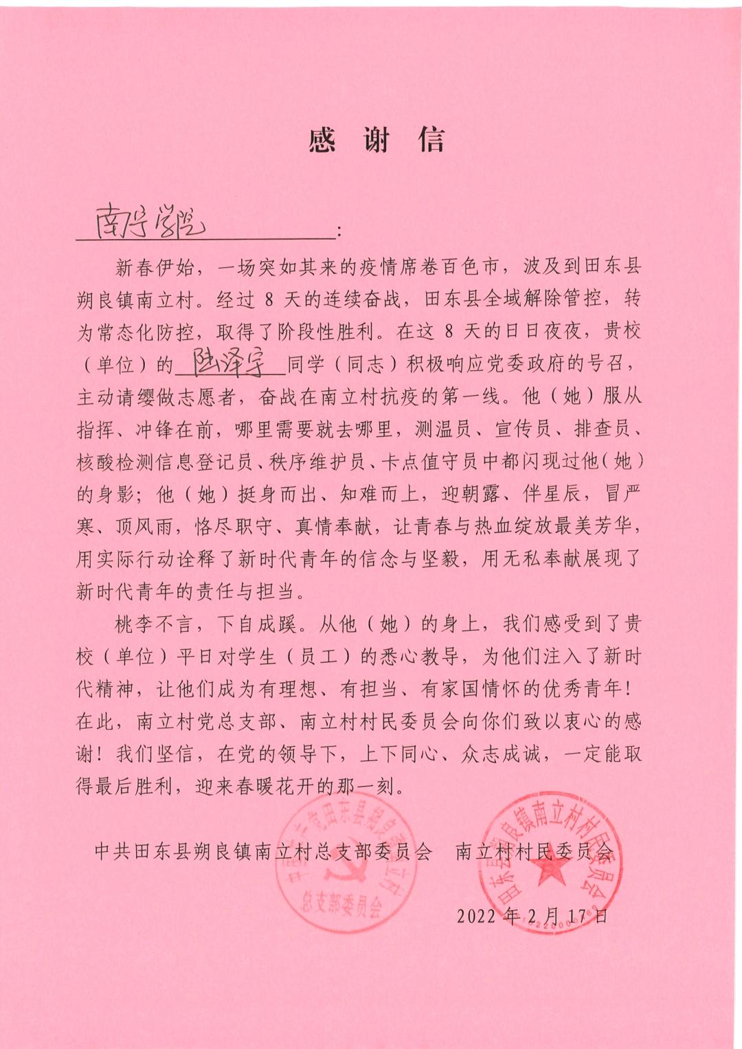 截止目前,我院收到共青团凌云县委、中共田东县朔良镇南立村总支委以及中共隆或镇委分别对三名同学的感谢信,这一封封的感谢信既是对陆泽宇、勾仕涛、王兆卿三位同学的表扬,也是对我院培养学生能力与责任的认可,我院将始终秉承“厚德厚学”的校训增强学生的奉献意识,坚定不移落实立德树人任务,激励更多学子奉献青春力量,为此次抗击疫情的胜利起到积极作用。(土木与建筑工程学院供稿 文/陈丽莎 樊君亮 图/王兆卿 勾仕涛 陆泽宇)