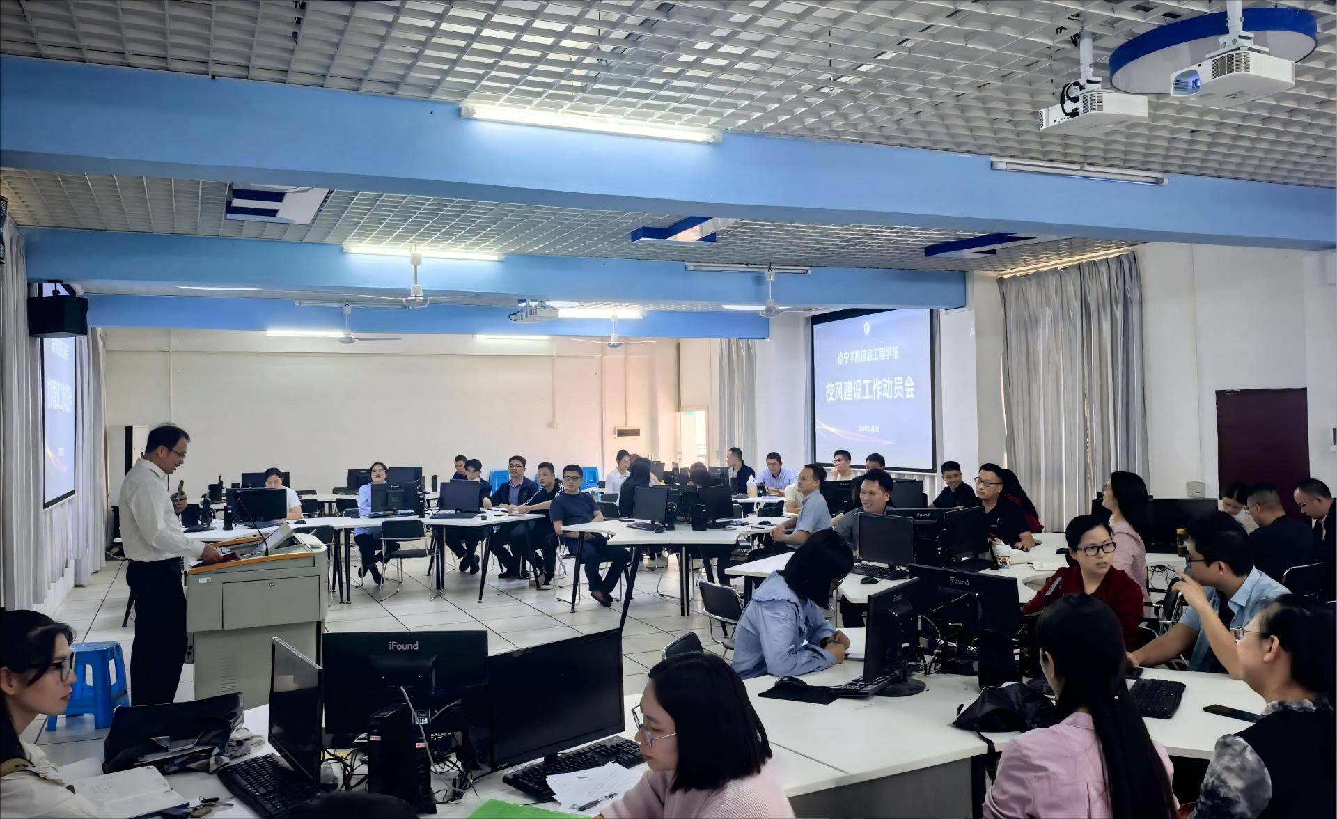 为深入推进校风建设工作,培育学院良好风气,更好地落实立德树人根本任务,促进学院特色发展和高质量发展,11月5日下午,信息工程学院在南硅谷A201室组织召开校风建设动员部署会,学院领导及全体教师参加会议。
