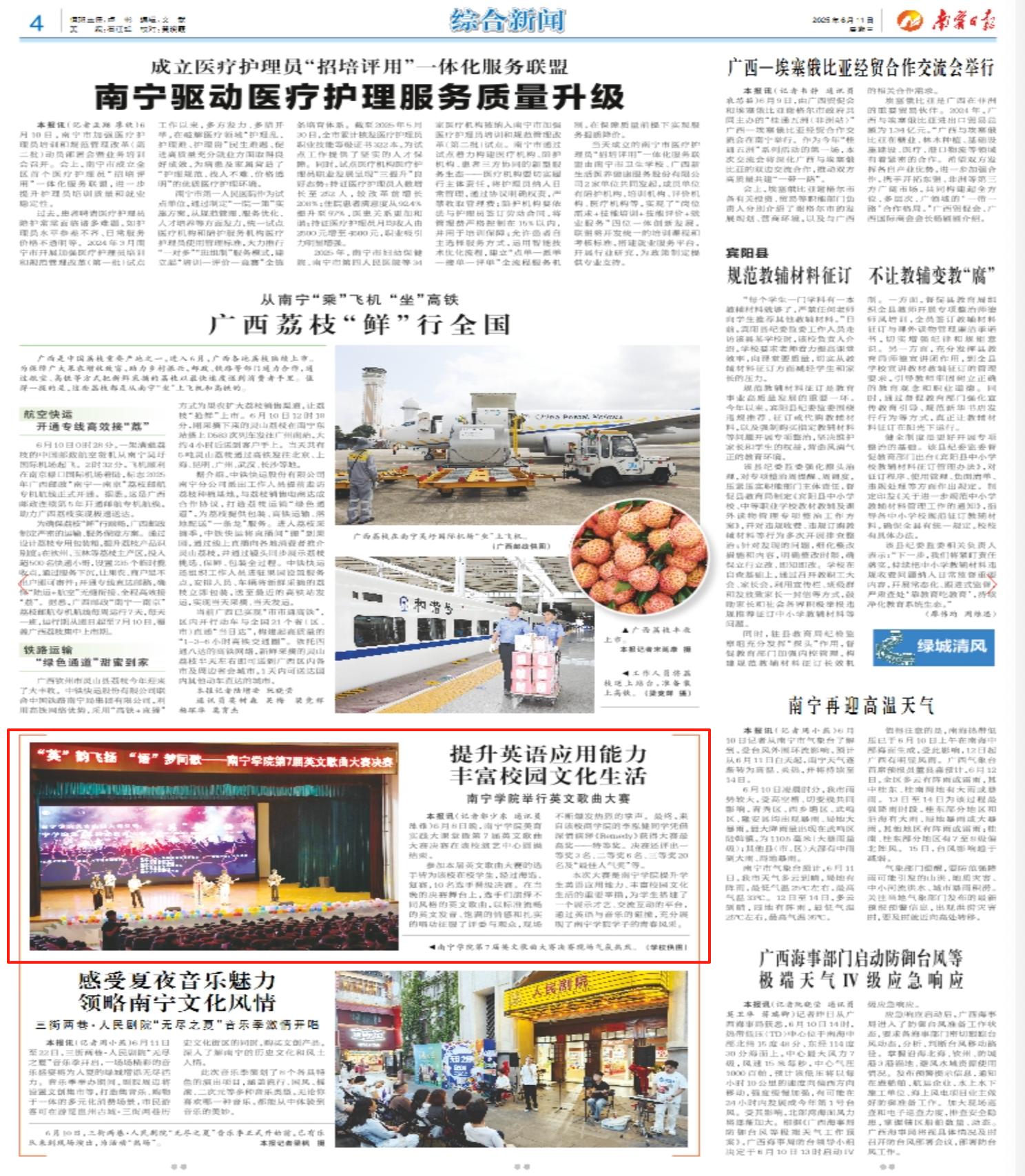 2.南宁日报:提升英语应用能力 丰富校园文化生活 南宁学院举行英文歌曲大赛 http://nnrb.nnnews.net:8080/nnrb/20250611/mhtml/page_03_content_002.htm#page3