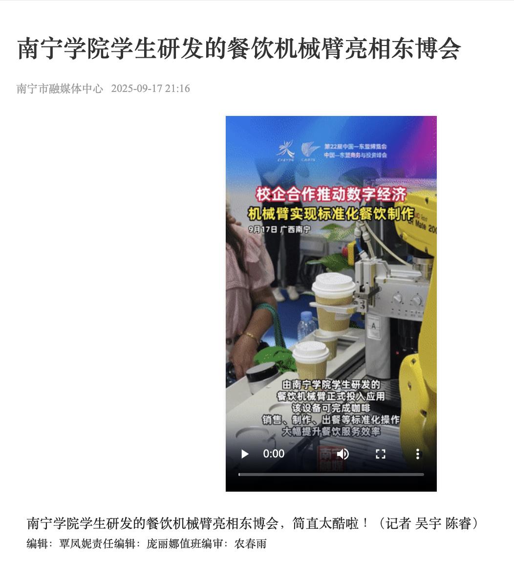 1.南宁电视台南宁学院学生研发的餐饮机械臂亮相东博会 https://jxpub.nntv.cn/s/202509/17/AP68cab49e5e0e4095577f7a3f.html