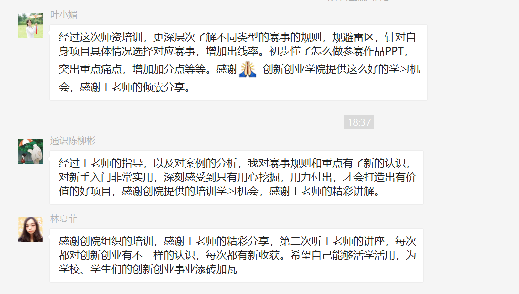 培训过程中,老师们积极思考,主动参与互动,根据自己的实际情况与思考瓶颈提出疑问,王晓明老师结合实例,针对这些问题作了详细的解答,其幽默风趣的讲授风格获得了学员们的一致好评。学员们的热情十分高涨,许多老师纷纷表示此次培训干货满满,收获很大,希望能够通过自己的微薄之力,努力为创新创业教育工作贡献,争取在第七届“互联网+”大赛中取得好成绩。