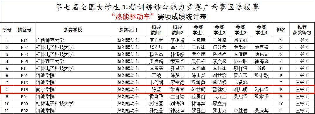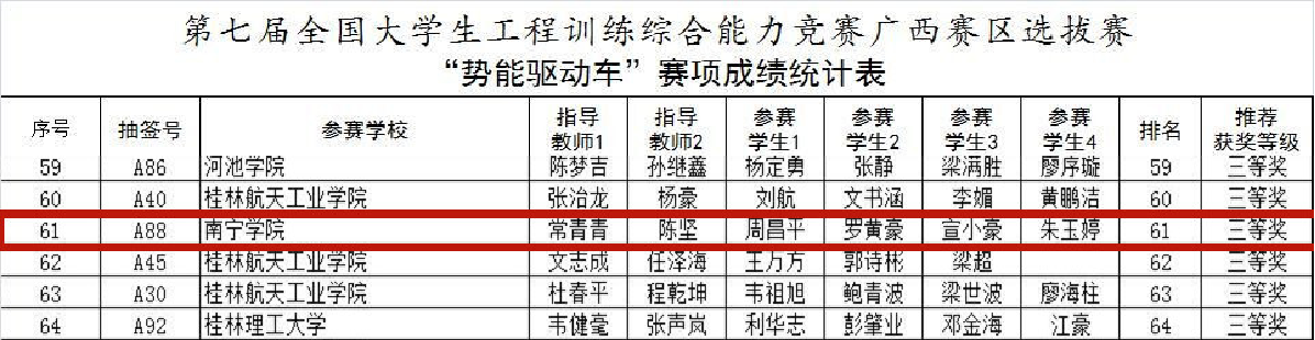 3月28日,第七届全国大学生工程训练综合能力竞赛广西区选拔赛顺利闭幕。此次南宁学院共有13支队伍进入现场赛,经过两天的比拼,最终喜获一等奖2项,二等奖5项,三等奖6项的好成绩!