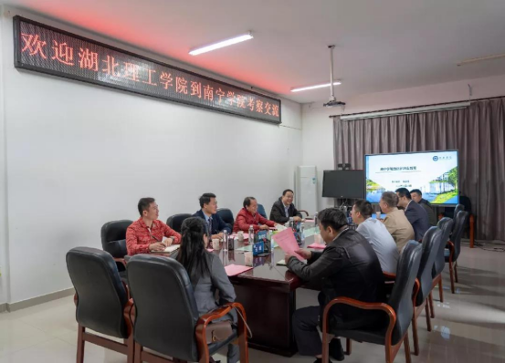 参观结束后,双方在行政楼518会议室举行座谈交流会。交流会上,陈雄章副校长向尹念东副校长一行介绍南宁学院整体办学情况及创新创业教育体制建设;创新创业学院院长马骏博士介绍了我校深化双创教育教学改革的举措及所取得成效。马骏院长提到我校创新创业教育近年来取得的成效是学校党委领导班子的大力支持、全校师生共同努力的结果:创新创业教育的开展首先是要良好的群众基础,需要得到全校师生的支持;其次是开展创新创业教育需要引入一定的外部资源,通过产教融合、产创融合、校友资源来推动;最后需要全面系统的推进创新创业教育工作。