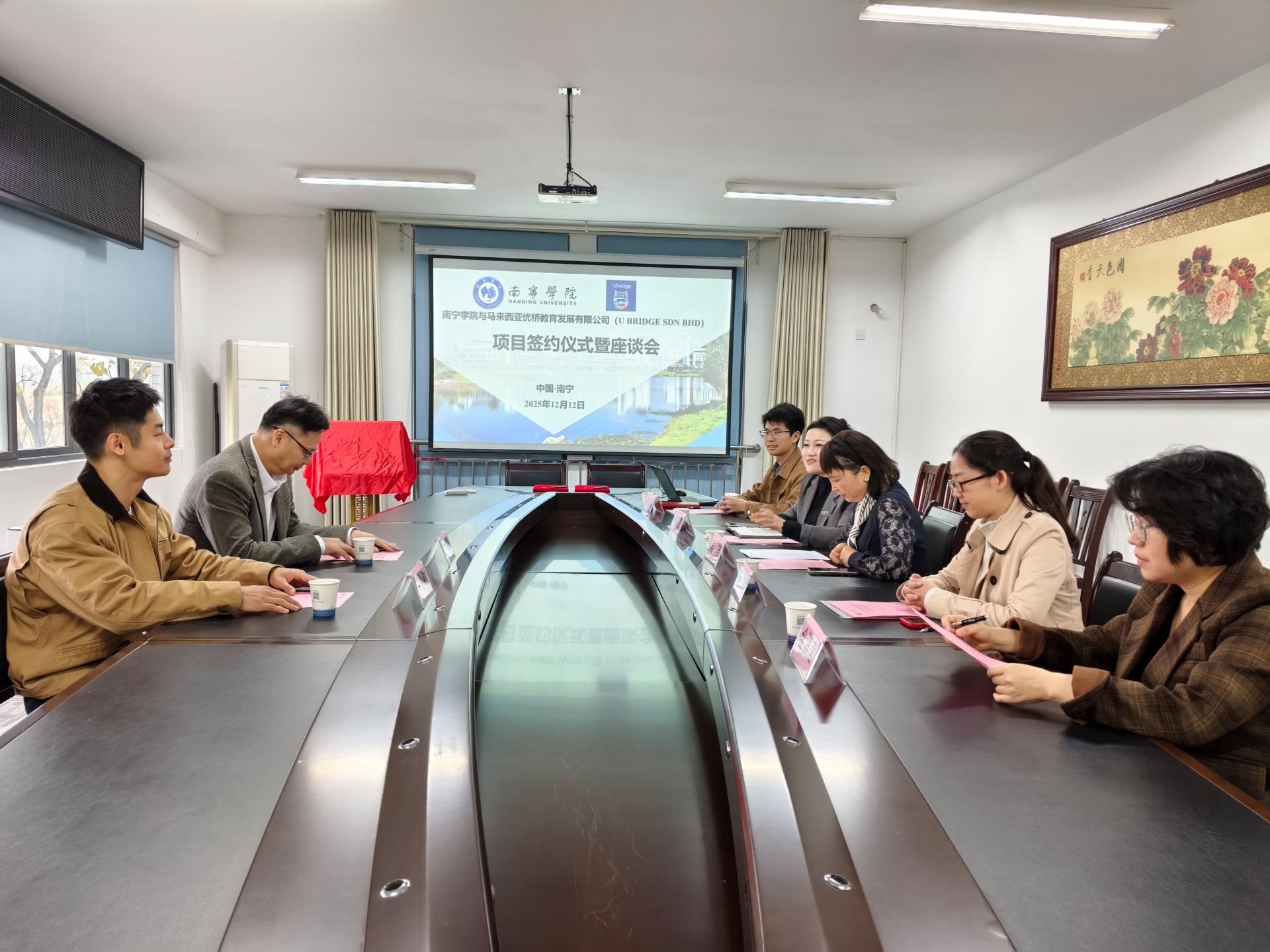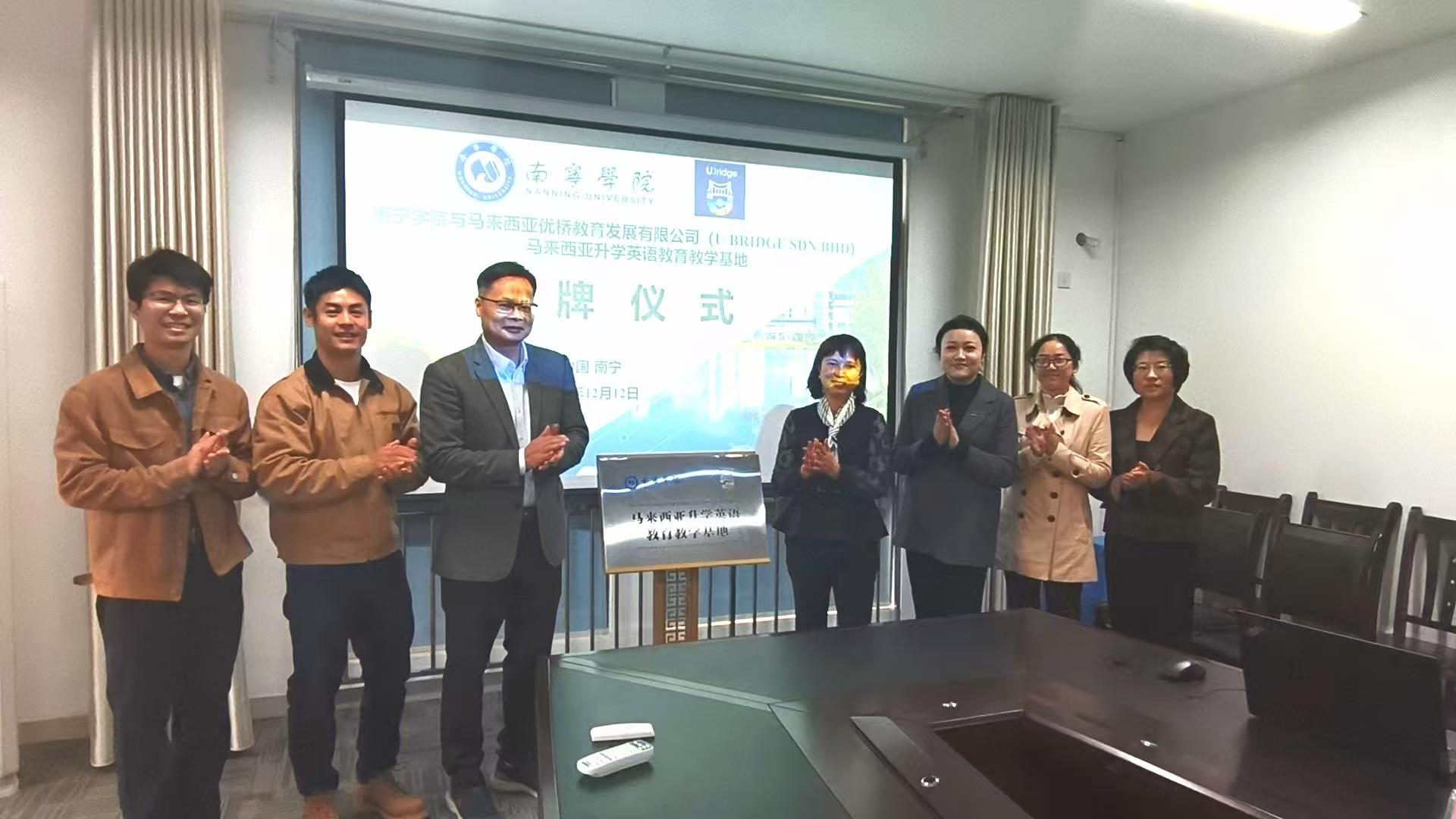 12月12日上午,马来西亚升学英语教育教学基地在我校挂牌成立。马来西亚优桥教育发展有限公司(U BRIDGE SDN BHD)董事长刘如涛、项目运营负责人李业勤一行莅临我校参加签约及挂牌仪式,并与东盟学院举行座谈会。东盟学院院长吴洁、发展规划与合作交流处副处长兼东盟学院副院长李隽宜、东盟学院第一教研室主任陈柳彬、专任教师全淇言、国际合作交流科干事罗浩诚出席上述活动。