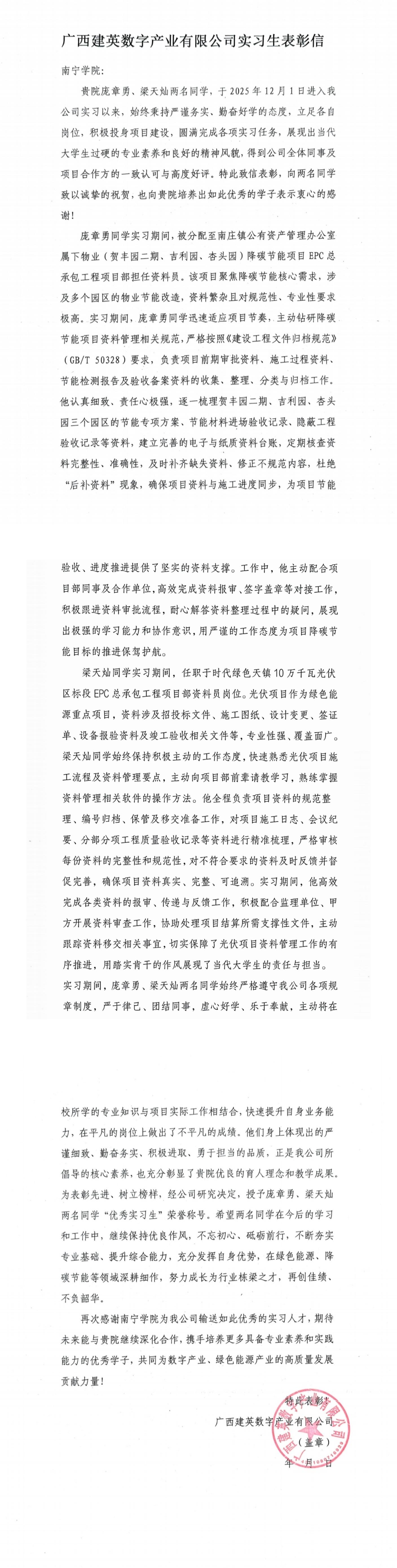 广西建英数字产业有限公司为我院实习学子发来表彰信