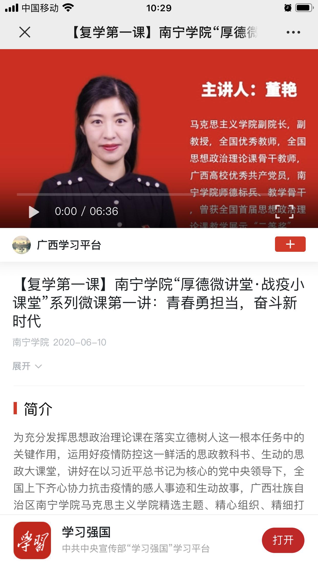 6月10日,由马克思主义学院副院长董艳老师主讲的“青春勇担当,奋斗新时代”第一讲微课在学习强国广西学习平台发布。董艳老师的微课通过抗疫斗争的不同视角,从理论的高度、历史的维度、现实的广度,依托“典型事迹”“最美逆行者”“平凡坚守”等鲜活案例,深入、立体地解读分析“战疫”中的思政元素,使学生深刻感悟抗疫中的新时代青年的担当奉献精神和爱国主义情怀。其他系列微课也即将陆续在学习强国平台播出。