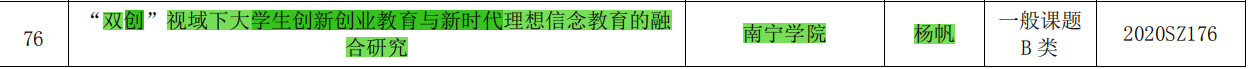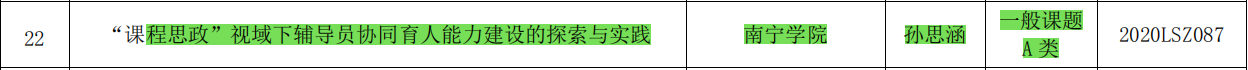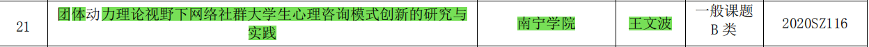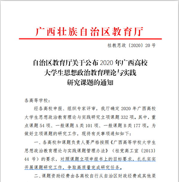近日,广西教育厅下达了2020年广西高校大学生思想政治教育理论与实践研究课题立项通知,经审定,共332项课题获得立项,包括重点课题、一般课题A类、一般课题B类。我校共获得5项立项其中,均作为课题负责人的孙思涵老师的《“课程思政”视域下辅导员协同育人能力建设的探索与实践》获一般课题A类立项,卢念老师的信息碎片化时代大学生思想政治教育面临的挑战及对策研究》、王文波老师的团体动力理论视野下网络社群大学生心理咨询模式创新的研究与实践、杨璐老师的《新媒体时代高校大学生安全教育工作有效路径研究》、杨帆老师的《“双创”视域下大学生创新创业教育与新时代理想信念的融合研究》,均一般课题B类立项。