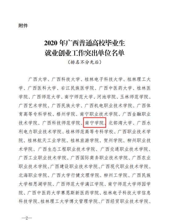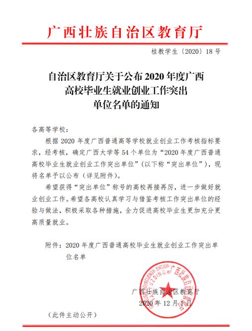 2020121日,广西壮族自治区教育厅发布《关于公布2020年度广西高校毕业生就业创业工作突出单位名单的通知》(桂教学生〔202018号),南宁学院获评为“2020年度广西普通高校毕业生就业创业工作突出单位”,这是学校连续8年荣获该项荣誉。