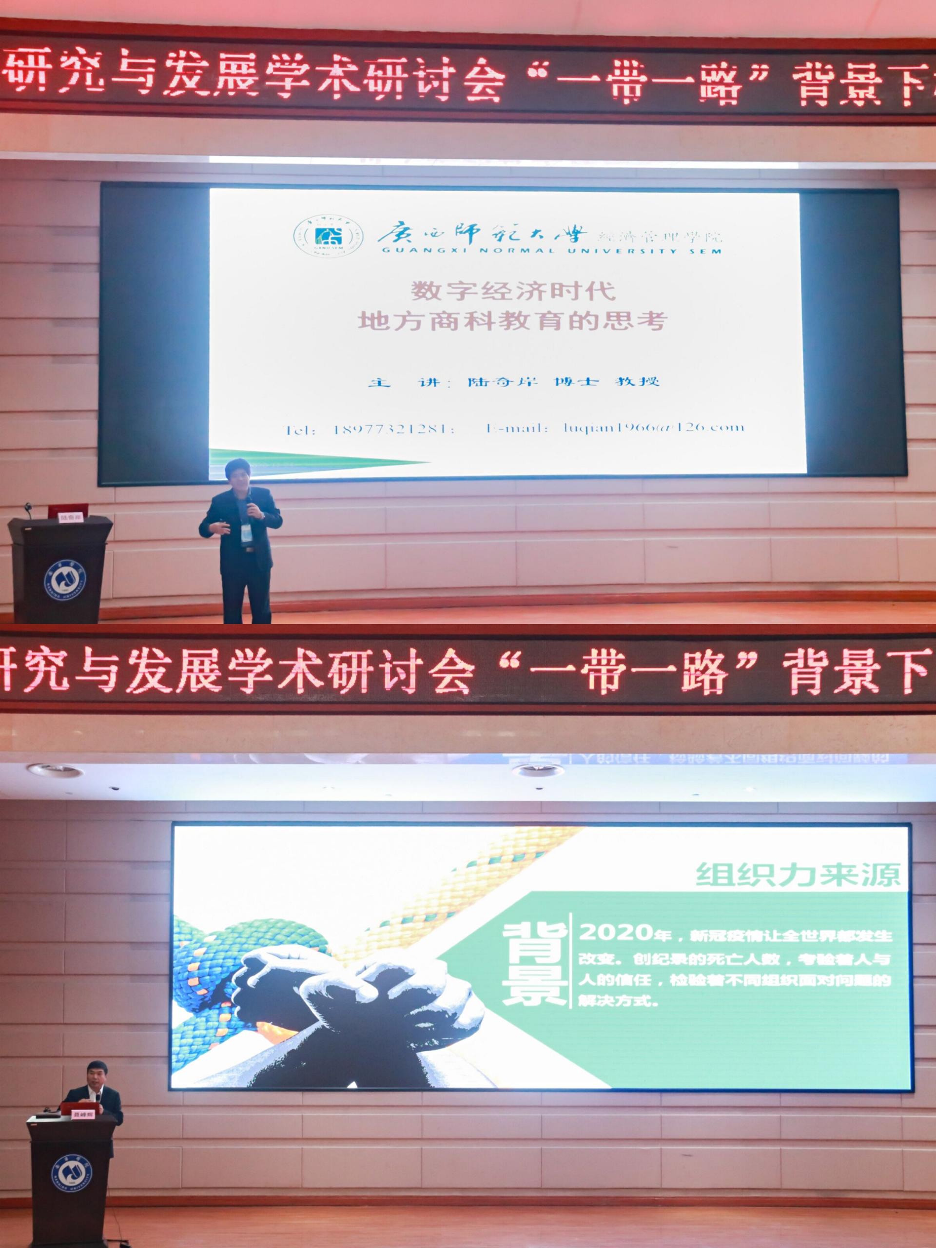 主题报告环节,华东师范大学郭晓合教授作“自由贸易试验区建设服务国家 FTA战略”主题报告,郭教授从为什么自贸试验区建设要接轨国家FTA战略、新时期两个自贸区联动发展现状、国际经济走势、国内经济分析等方面向与会嘉宾作了分享。广西师范大学经济管理学院院长陆奇岸教授在他的主题报告中强调了大数据的重要性,并分析了大数据时代下广西工商管理专业所处的情境,指出了商学教育在滚滚而来的数字经济大潮中的具体出路。广西民族大学国际教育学院党委书记廖东声教授作“双万计划背景下广西工商管理学科国际化人才培养的思考”主题报告,廖东声教授对双万计划背景作了详细分析,并指出了双万计划背景下广西工商管理学科国际化人才培养的问题和解决对策。广西财经学院工商管理学院副院长罗胜教授作“商学教育赋能广西企业成长”的主题报告,他结合广西财经学院“和君-新财子”培养模式向与会嘉宾深入浅出的阐述了如何用商学教育赋能广西企业成长。桂商总会执行秘书长邱健在发言中结合习总书记赋予广西的三大定位,从桂商总会成立的背景、功能作用、发展愿景等方面展现了桂商总会在新时期肩负的责任和使命。南宁市青秀区政协委员、广西怡亚通大泽深度供应链管理有限公司董事长聂峰辉作“组织力来源”主题报告,总结出组织力来源于能量,并向与会嘉宾分享了自己和企业的成长过程,展现了一个企业家勇于站在时代浪潮中披荆斩棘的奋斗精神。
