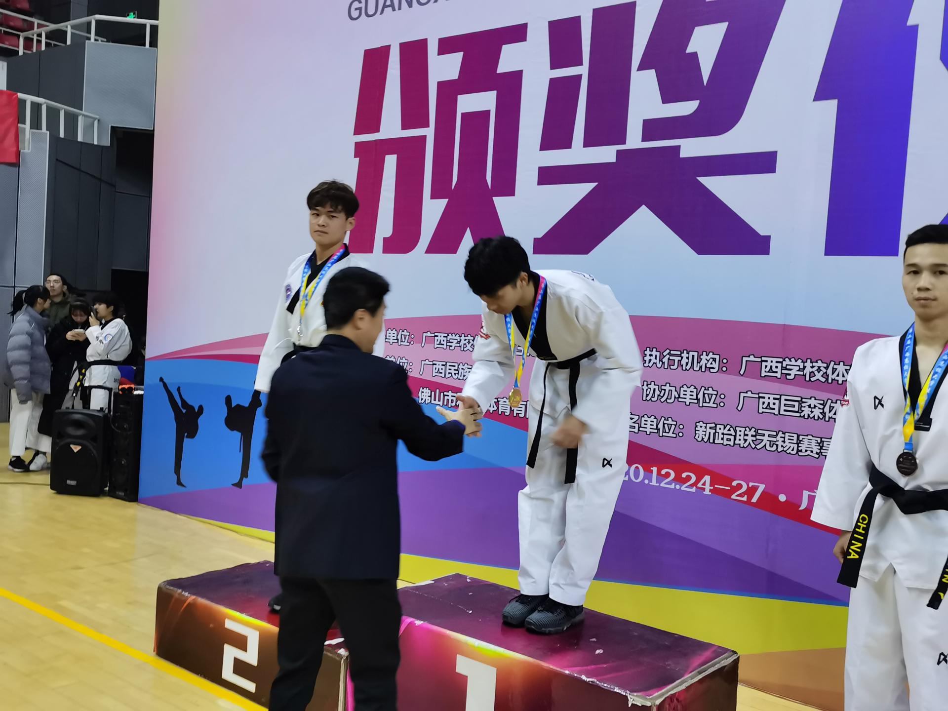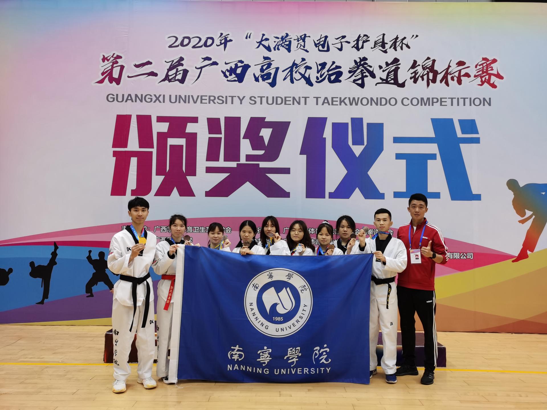 2020年1226-27日由广西体育艺术卫生学会主办的第二届广西高校跆拳道锦标赛在广西民族大学隆重举行,来自全区各地23所高校的300余名学生运动员进行了激烈的比拼!学校选派10名学生参加了此次比赛,由体育教研室刘奕、唐雨、朱昌胜老师担任教练。经过两天的激烈角逐,南院学子最终获得金牌一枚和铜牌六枚的好成绩。