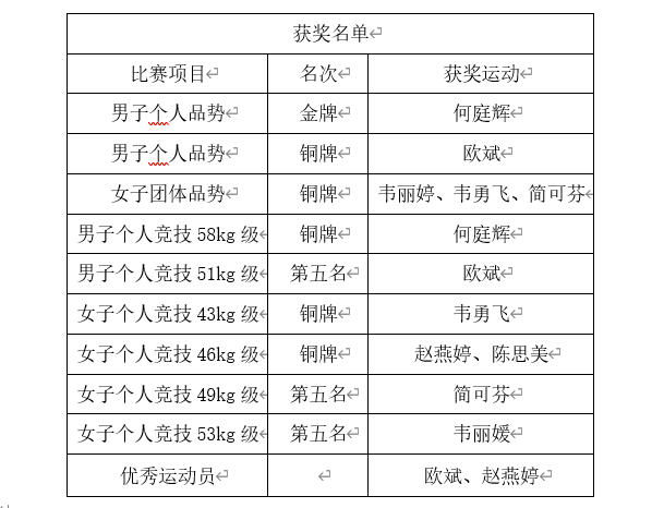 比赛前,校教练员、运动员经过了认真备战和刻苦训练,最终在赛场上,运动员们充分展现出了个人实力,体现出年轻人无畏挑战,坚持自我的勇气。何庭辉同学在男子个人品势项目中打出一套完美的动作以绝对的优势获得金牌,欧斌同学也获得铜牌。在个人竞技项目中,赵燕婷同学在半决赛中开场便意外受伤肩关节脱臼,忍剧痛坚持比赛并一直拼进加时赛,虽最终惜败获得铜牌,却充分展现了南院学子敢打敢拼、永不放弃、战斗到最后一刻精神,赢得了所有对手和现场观众的尊重。