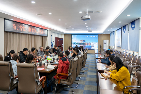 会议有两个议程,一是关于《成立南宁学院归国留学人员联谊会实施细则》(征求意见稿)征求意见,二是归国留学人员围绕学校发展建言献策。首先是文副校长发表讲话,介绍了本次座谈会的目的和意义,他指出国际交流是大学的五大职能之一,参会人员都是海外留学回国的老师,国际视野比较开阔,在不同教学和科研岗位上工作,兢兢业业。学校已经过了合格评估,紧接着是思考如何提高学校的教育教学水平,希望参会的老师们为学校的发展建言献策。同时结合学校实际和个人的发展,谈谈如何继续拓展自己在海外的研究方向和开辟新的研究领域,为学校飞速发展升格为南宁大学贡献自己的力量。随后,统战部部长王静静讲解了南宁学院归国留学人员联谊会成立的必要性,并解读了成立《南宁学院归国留学人员联谊会实施细则》(征求意见稿),与会人员就这个议题开展了热烈的讨论。接着国际交流处处长韦平就文副校长和王静静处长的讲话,结合会议精神列出三个提纲引导大家自由发言。参会的归国留学人员相互分享自身在国(境)外的留学经历与体会、个人在教学科研工作中的感悟,对学科、专业建设等方面积极建言献策。