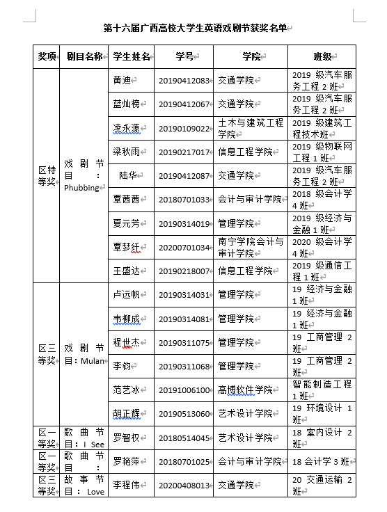近日,由广西高校大学外语教学研究会与广西高校大学生英语戏剧节组委会共同举办的第十六届广西高校大学生英语戏剧节获奖情况揭晓,南宁学院选送的作品获得英语微电影特等奖一项、三等奖一项,英文歌曲一等奖两项,英语故事讲演三等奖一项,亮眼的成绩为学校赢得了广泛赞誉。