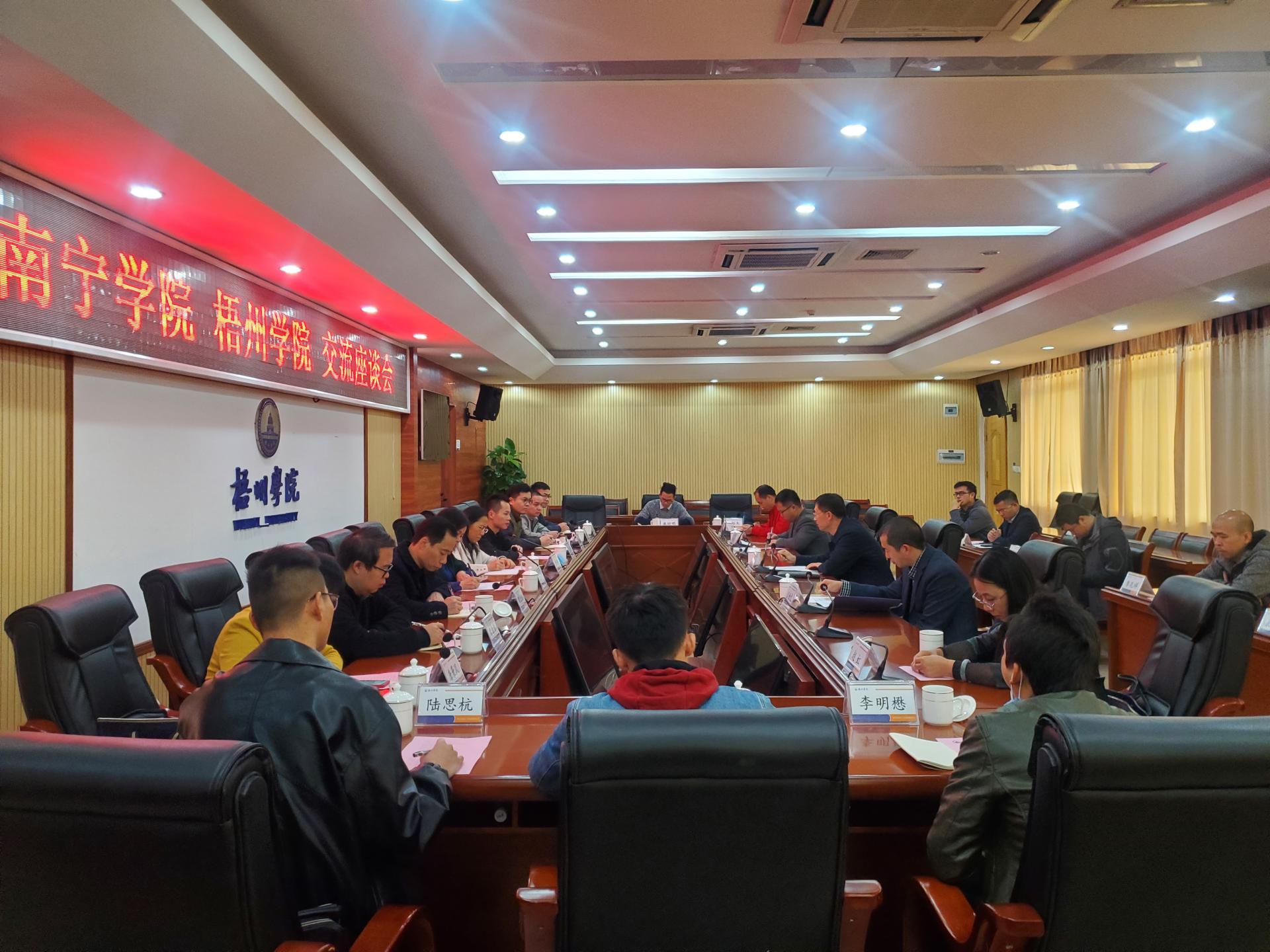 12月28日上午9:00,考察交流座谈会在梧州学院明理楼第一会议室举行。梧州学院教务处奚广生处长、彭金虎副处长、张俊杰副处长等领导,南宁学院教务处黄瓅处长、蓝军斌副处长及校其他考察人员参加会议。会议由奚广生处长主持。