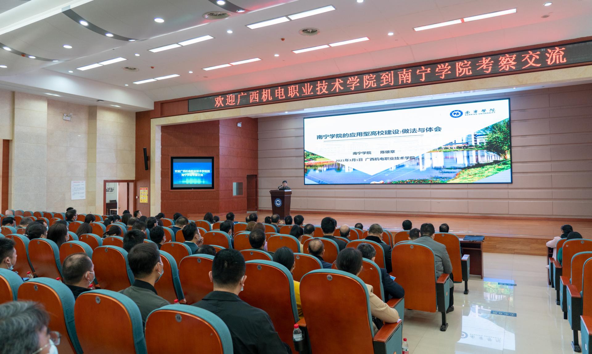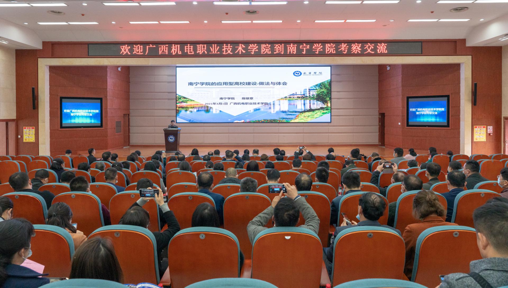 3月1日上午,广西机电职业技术学院党委书记梁辉、校长赖晓桦携考察团一行110余人到南宁学院考察交流。南宁学院党委书记刘彪、校长李栋学、副校长陈雄章及相关部门负责人参加考察交流活动。
