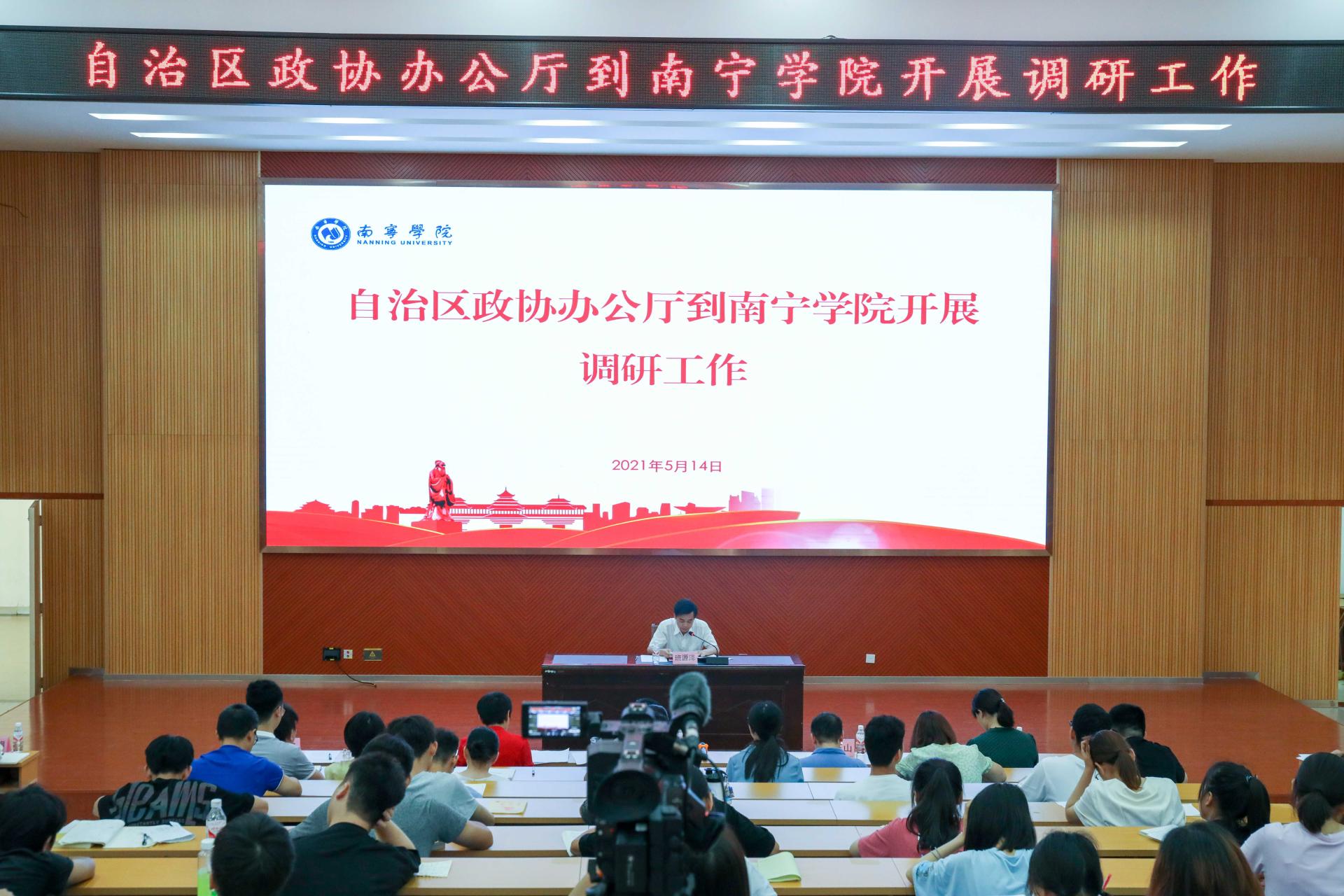 5月14日上午,自治区政协副秘书长班源泽一行6人到南宁学院考察调研,学校党委书记刘彪,学校党委副书记、纪委书记覃存民,统战部、马克思主义学院负责人,马克思主义学院师生代表共100人参加调研活动。